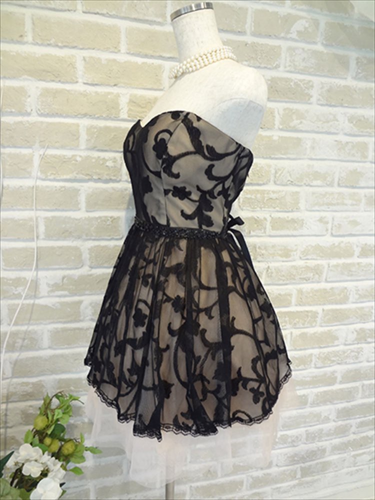 黒の花柄ベアドレス。胸下とスカートの位置の切り替えが高めの為足が長く見えるデザインとなっております。ウエスト部分にはリボンがあり、バックスタイルのリボンにするととても可愛いです。スカートの長さは短めでバルーンスカートになっています。ドレス下部分にはベージュカラーの生地になっていて上品で黒の強い印象を柔らかく魅せてくれます。パーティや謝恩会、同窓会等におすすめです。羽織もののお色やお素材は選ばずお選び頂けます。オールシーズン着用できるドレスです。