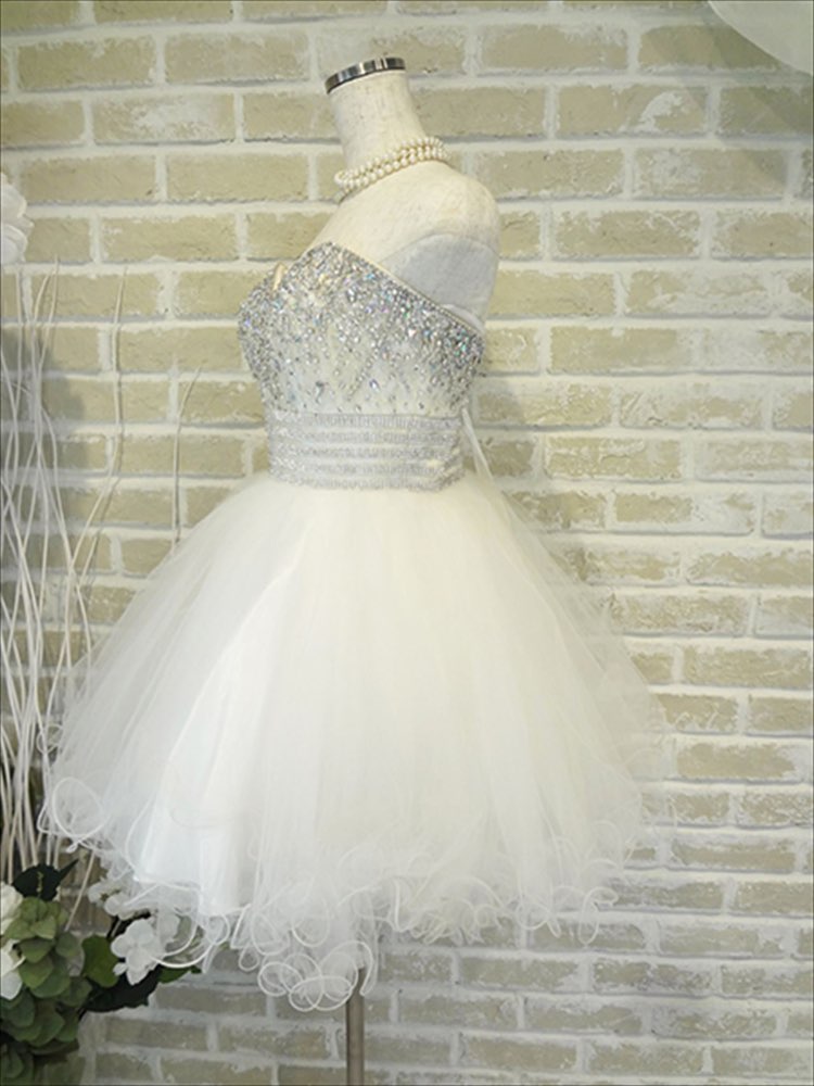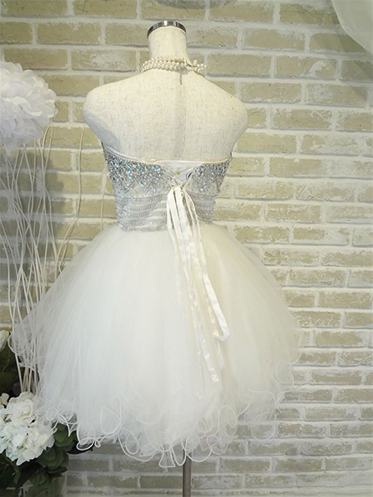 ホワイトベアドレス。胸元にビジューやクリスタルがちりばめられており、バルーンスカートがチュールでとても可愛らしいです。バックのリボンもついていて後姿にもこだわったドレスになっております。カラーがシンプルなため、カラーパンプスやバックでポイントにしても可愛いです。ボレロやストールで合わせても可愛く、カジュアルな二次会、謝恩会やパーティにもぴったりです。