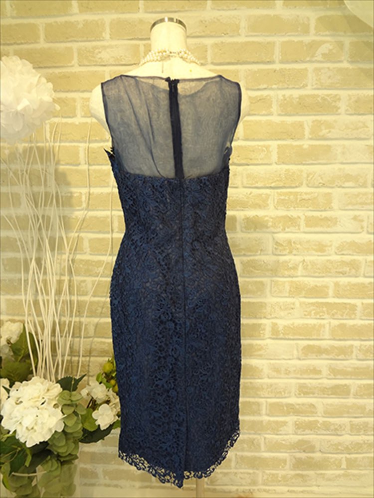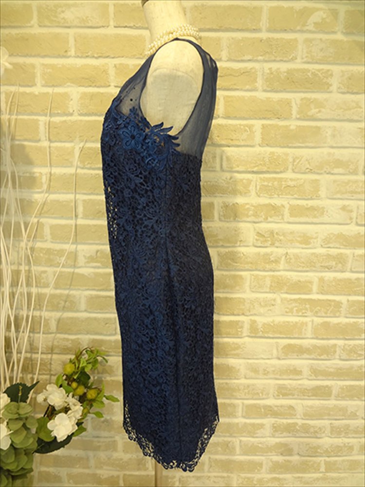 ネイビーレースタンクトップ型ドレス。固めのしっかりしたレース、タイトでとてもラインが綺麗なドレスです。鎖骨あたりが透けていて出しすぎないさりげないセクシー、色っぽさがあります。大人っぽいドレスになっておりますので、羽織はストールがおすすめです。デザインがとても可愛らしい女性らしさがあるドレスなので結婚式や会社のパーティなどお写真をたくさん撮られる機会には是非おすすめな1着です。羽織はタイトスカートを綺麗に魅せてくれるストールで、バックはゴールドで華やかにゴージャスにまとめても綺麗ですし、ビビットカラーでポイントを入れてもおしゃれなコーディネートになります。
