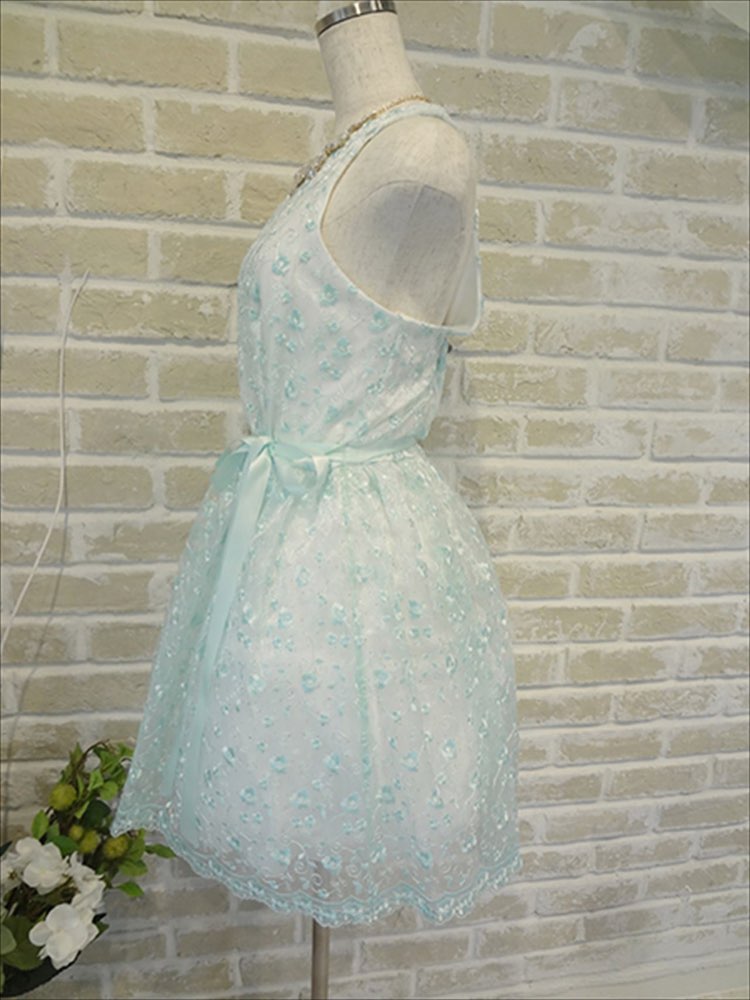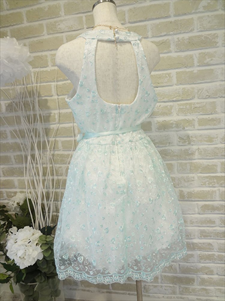 グリーンの花柄チュールドレス。前から見るとシンデレラのような可愛らしいですが、後ろには背中が見えるデザインでさりげなく色っぽいセクシーな印象に魅せるドレスで可愛さだけでは物足りないと感じる方におすすめな贅沢なドレスです。ウエスト部分にはリボンがついていて、ネックレスはつけなくても花柄で可愛いですがもしつけるなら華奢なものをつけるとドレスのデザインも目立たせてくれておすすめです。ボレロやストールも相性がいいので謝恩会・パーティはもちろん結婚式のゲストドレスにも幅広くお使い頂けるドレスです。