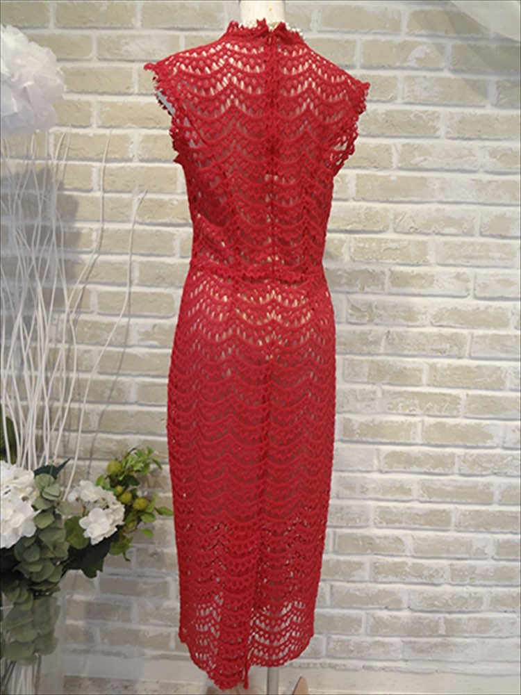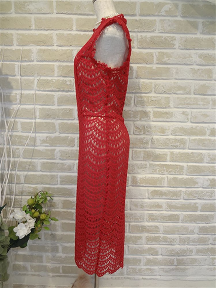 真っ赤の総レースドレス。デコルテ周り、膝下が透けるタイプですので長めの丈でも綺麗に魅せることが出来ます。真っ赤なカラーが十分に華やかですが、ゴールド系のアクセサリーやバック、パンプスを合わせていただきますとより一層大人っぽい印象になります。1枚で着ていただいても良いですし、結婚式の際には、ボレロやストールを合わせて頂くと上品になります。丈が長めのドレスなので高身長の方にもぴったりです!