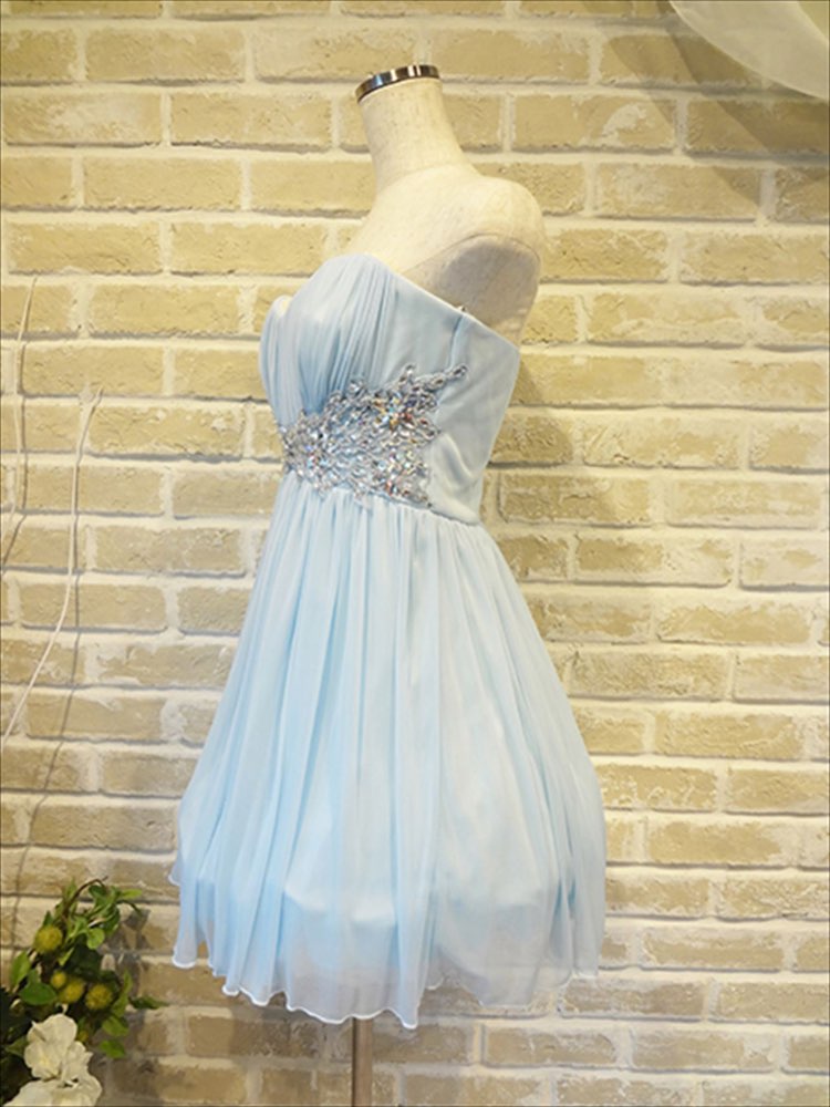 青空をイメージしたようなとても綺麗なスカイブルーのドレスです。ミニ丈でとても可愛いデザインのドレスです。シフォン素材のスカートが動くたびにひらひらと揺れてそのうえ、ウエスト部分のビジューがキラキラと光り、目立つこと間違いなしのドレスです。謝恩会やパーティーに特にオススメな一着となっております。