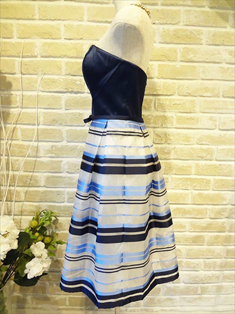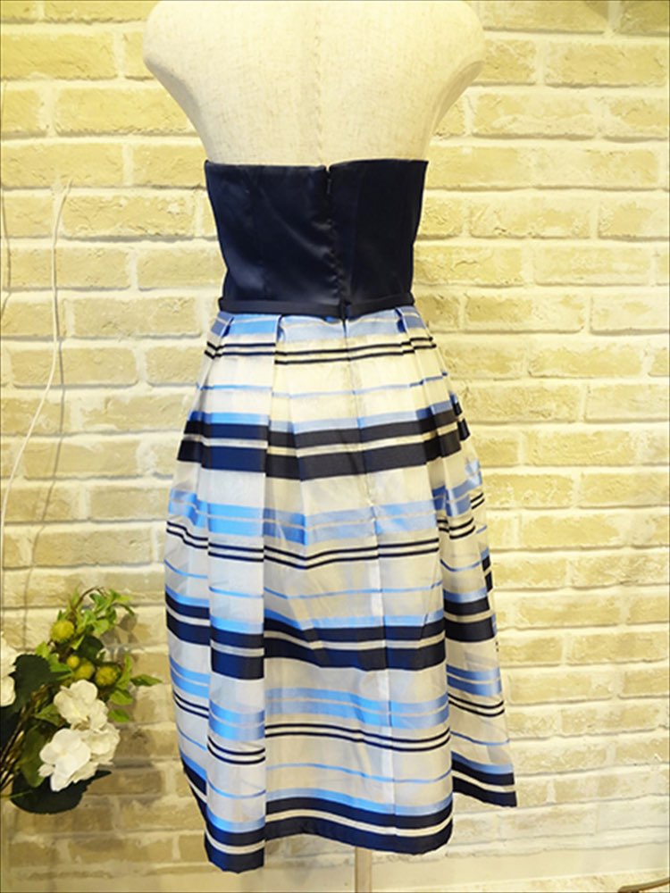長めのベアドレス。ブルーのボーダーが鮮やかで明るい印象にします。特に夏に映える一着です。サマーウエディングや、リゾートウエディング、プールウエディングにもオススメです。スカートがふわっとしてますので可愛らしい雰囲気にもなります。同系色の小物を合わせて爽やかコーディネートもいいかなと思います。