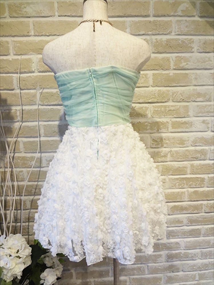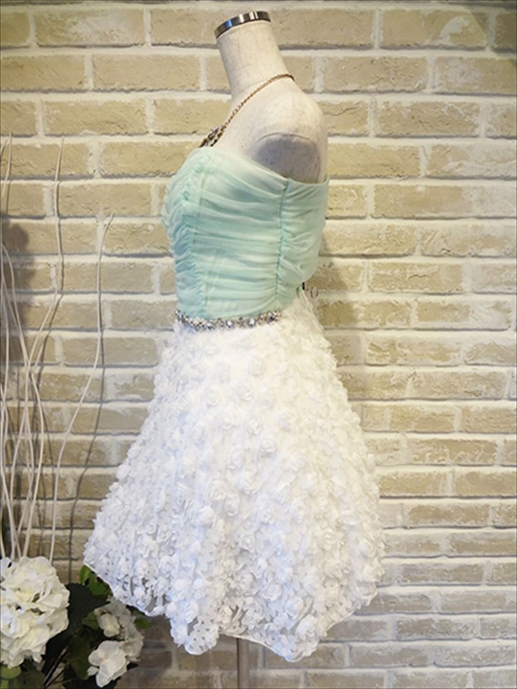 立体的なお花がスカート全体にあしらわれたとても可愛らしいAラインドレスです。ミントグリーンとホワイトのバイカラーがフェミニンさと爽やかさも演出してくれます。パールの小物とも相性抜群で、どんなシチュエーションでも映える一着です。