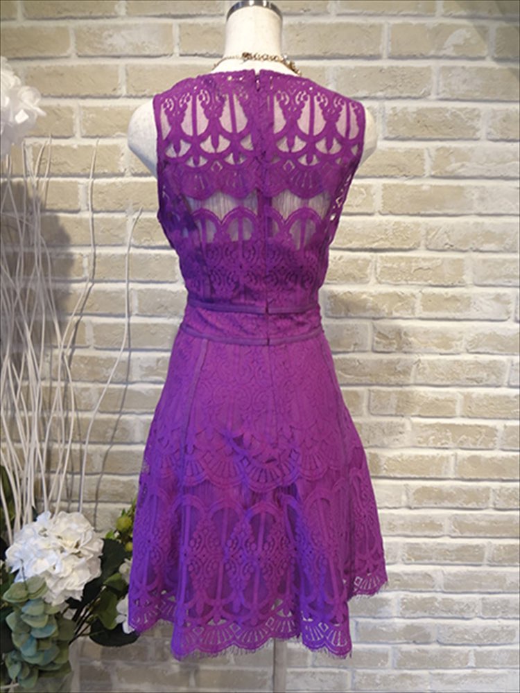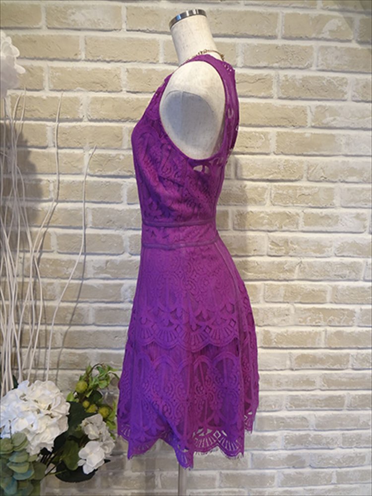 明るいパープルでとてもお上品なドレスです。胸元がレースでのシースルーになっていますが、ネックレスを付けるとまた一気に雰囲気が変わります。このドレスは、付けるアクセサリーでお上品な感じにもクールな感じにもなります。一着で何パターンも楽しめちゃうドレスです!!