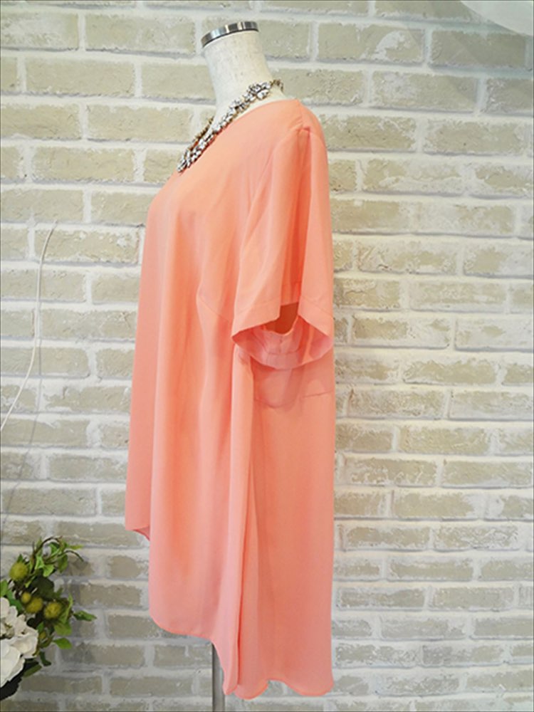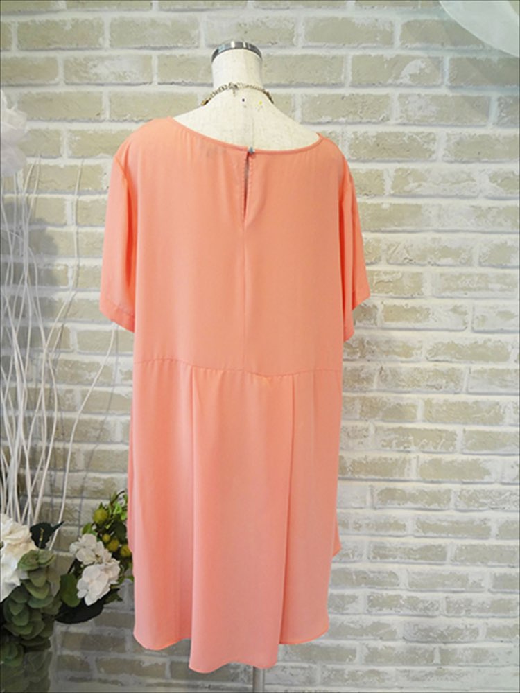 フィッシュテールスカートが可愛いコーラルピンクのドレスです。ウエスト部分に、ベルトをつけてアクセントをつけても可愛いドレスです。元々ゆるい感じでのドレスになりますので、マタニティードレスとしてもお使いいただけます。フェミニンさも兼ね備えておりますなので、多様多種着れるドレスです。