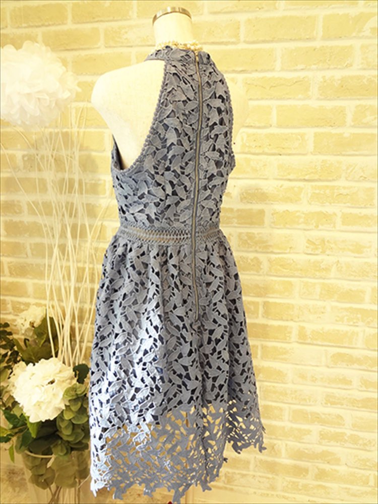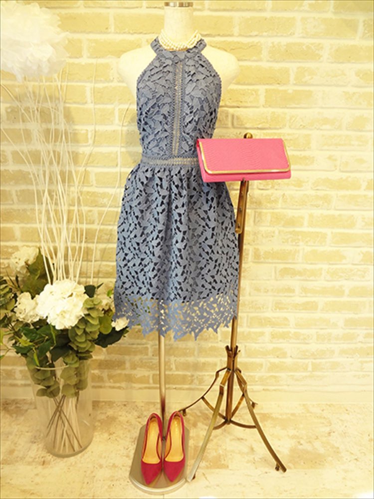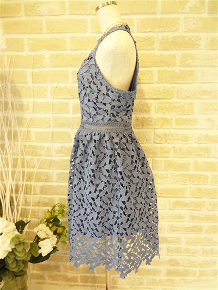全体レース使いの淡いブルーの大人可愛いドレスです。ウエスト部分がレース越しに透ける所も可愛いドレスです。スカートは少しふんわりしています。生地は厚目なので一年通してお使いいただけるドレスです。セクシーさと可愛さ、フェミニンさを兼ね備えた一着です。