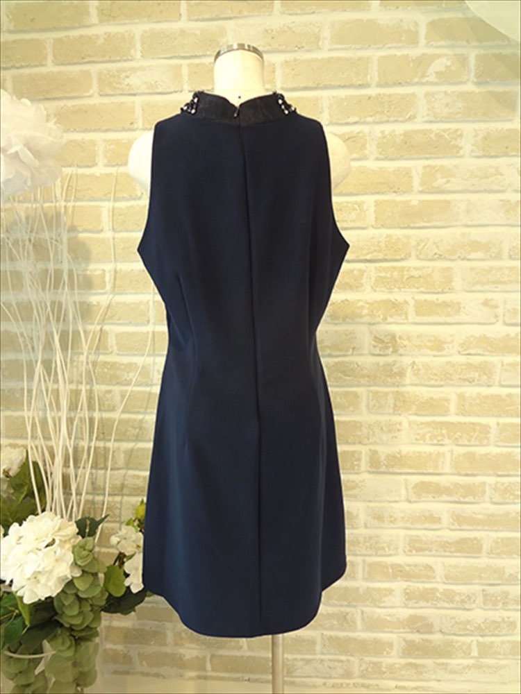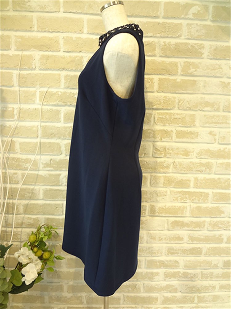 首元にたくさんのビジューがついていて顔回りがとても華やかです。ネックレスもいらないかな?くらいの華やかさがあります。さらにVカットで胸元を綺麗に見せてくれます。ワンポイントでセクシーさがありとても大人な雰囲気です。膝丈なのでただセクシーとゆうわけでなく、気品も漂っています。