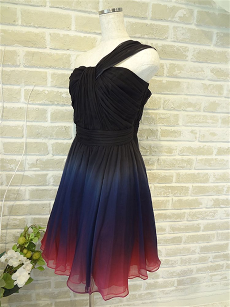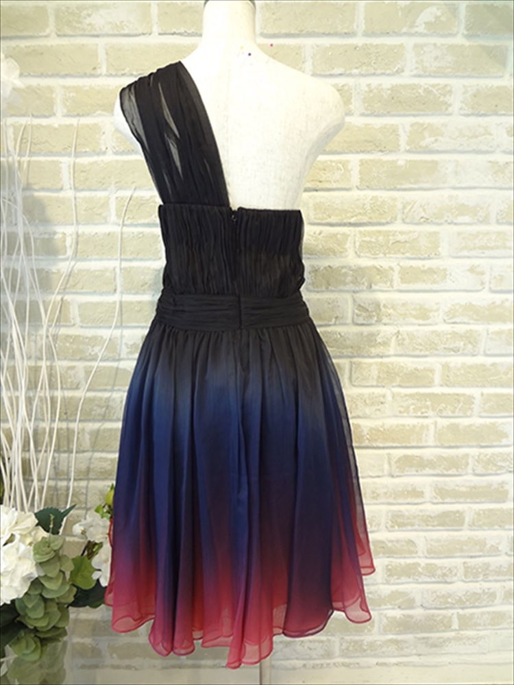 上からブラック、パープル濃いピンクときれいなグラデーションになっているワンショルダードレスです。ウエスト部分には切り返しラインもあり、形もきれいです。羽織ものはファーボレロなどでシフォン素材のドレスと差をつけますと冬のシーズンにもぴったりの雰囲気にもなります。落ち着いたカラーとなりますのでアクセサリーやバッグを派手めなものでも可愛く、きれいに着れるドレスかと思います。