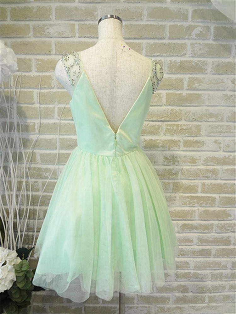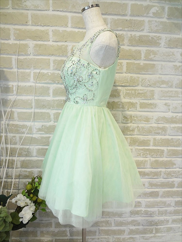 爽やかできれいなメロングリーンのミニ丈のドレスです。胸元のシースルーがセクシーでありながらウエストから上にはキラキラと光るビーズがたくさんちりばめられていてフェミニンさもあります。スカートは少しふんわりとしています。このまま一着で着ていただいてもとても可愛いです。背中のVカットも後ろ姿を綺麗に演出してくれます(^^♪