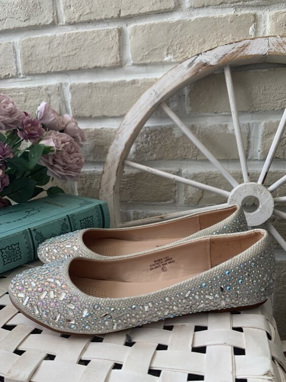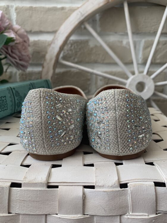 シルバー×オーロラビジュー付きフラットシューズです。 とても履き心地の良いフラットタイプのデザインで、ヒールが苦手な方や、ご妊娠中の方、身長差が気になる方にも履いて頂けると思います。 キラキラと輝くので、履いているだけで存在感抜群です。 生地が少し硬めの素材になっております。