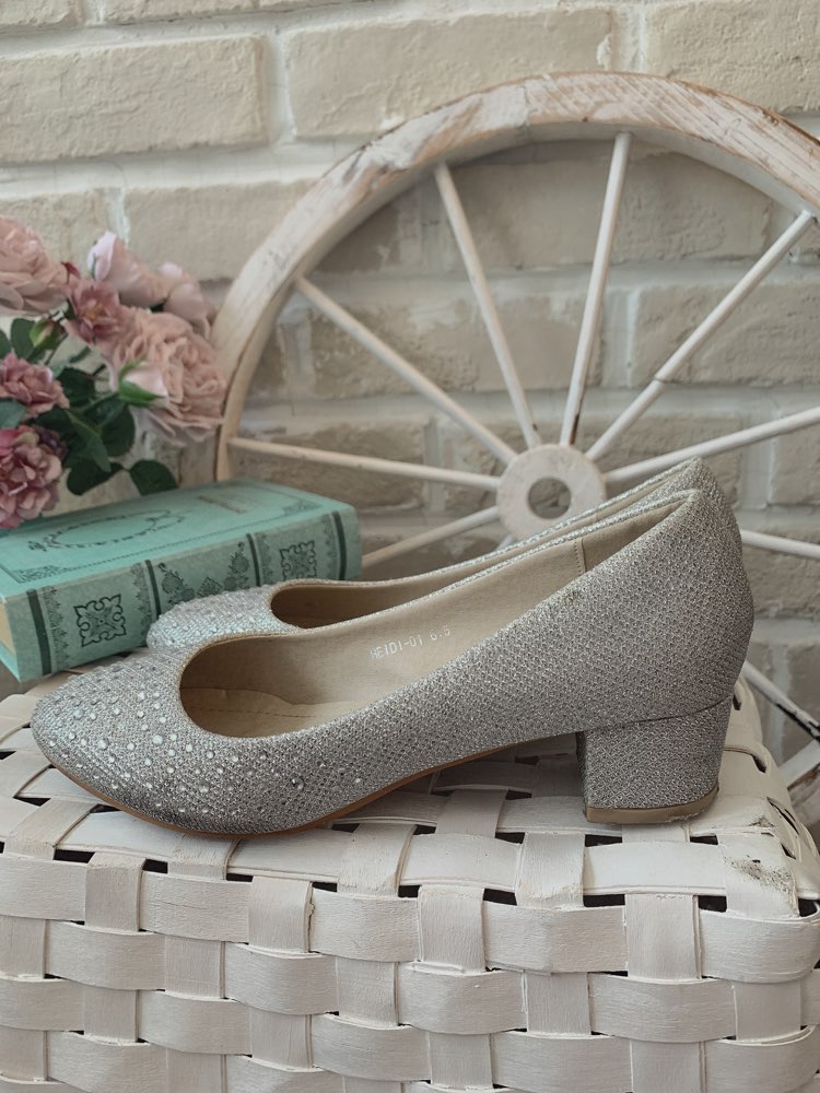 シルバーラメのスワロフスキーローヒールパンプスです。