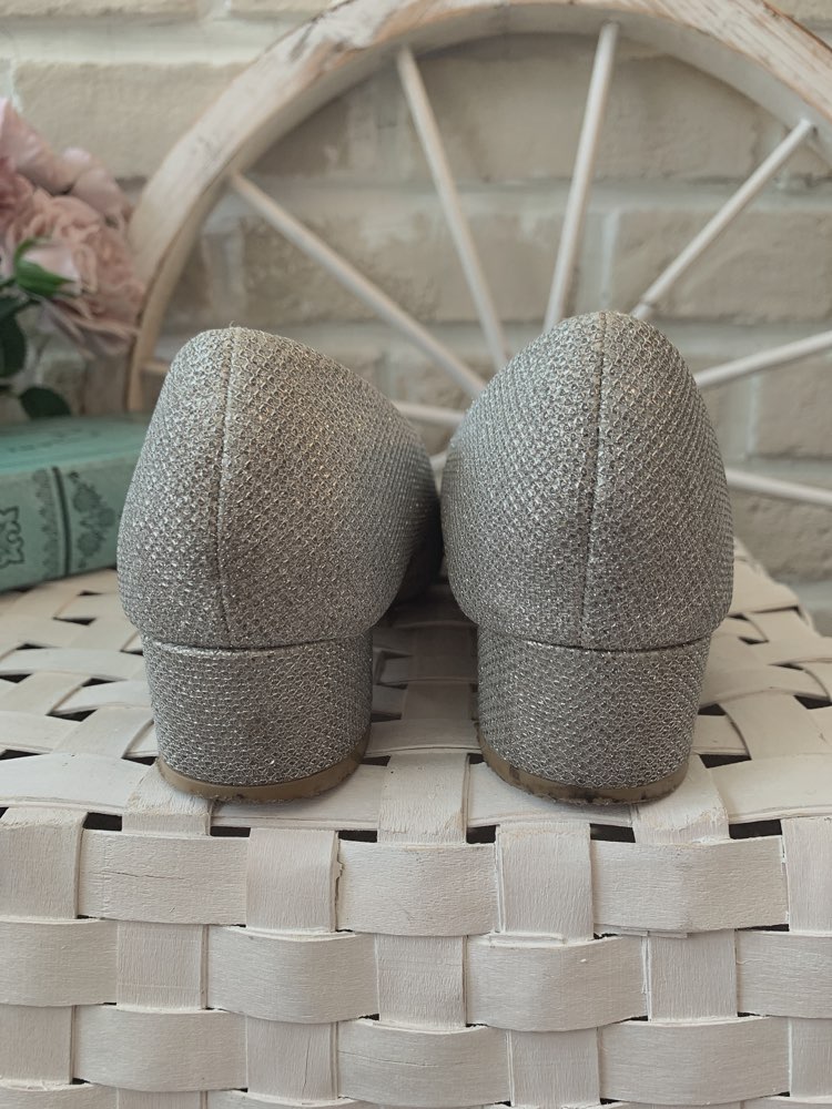 シルバーラメのスワロフスキーローヒールパンプスです。 とても履き心地の良いローヒールタイプのデザインで、ヒールが苦手な方や、ご妊娠中の方、身長差が気になる方にも履いて頂けると思います。 キラキラと輝くので、履いているだけで存在感抜群です。 生地が少し硬めの素材になっております。