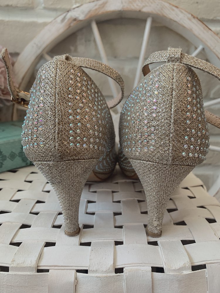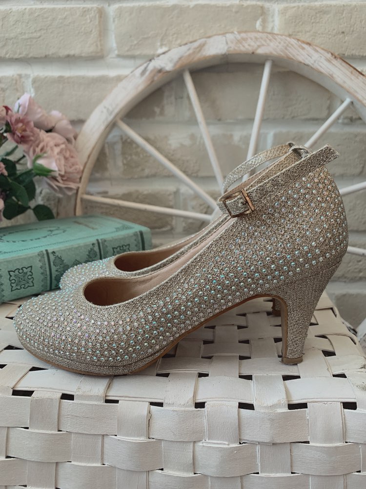 シャンパンゴールド×オーロラスワロフスキーパンプスです。 とても履き心地の良いローヒールタイプのデザインで、ストラップも付いているので ヒールが苦手な方や、ご妊娠中の方、身長差が気になる方にも履いて頂けると思います。 キラキラと輝くので、履いているだけで存在感抜群です。 生地が少し硬めの素材になっております。