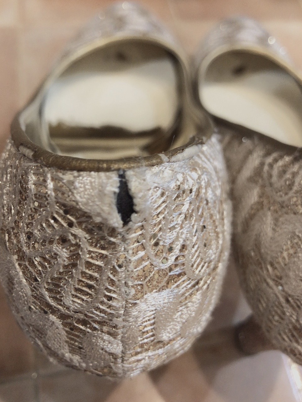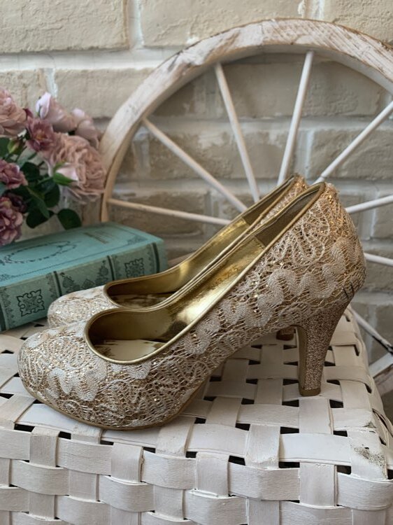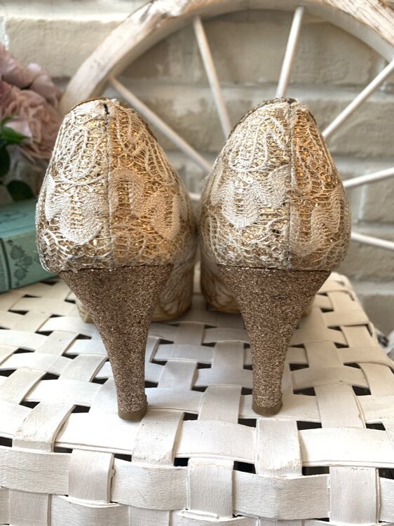 ゴールドラメレースパンプスです。とても履き心地の良いローヒールタイプのデザインで、普段ヒールを履かない方にも履いて頂けると思います。 ヒール部分もラメになっていてとても可愛らしいデザインになっております。