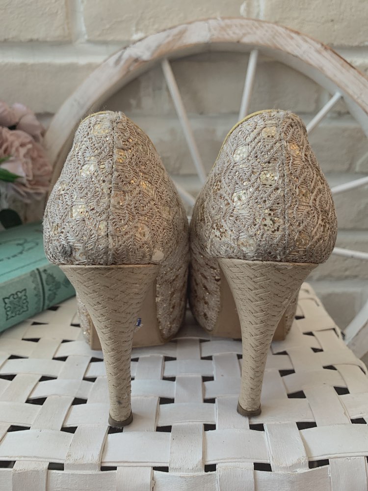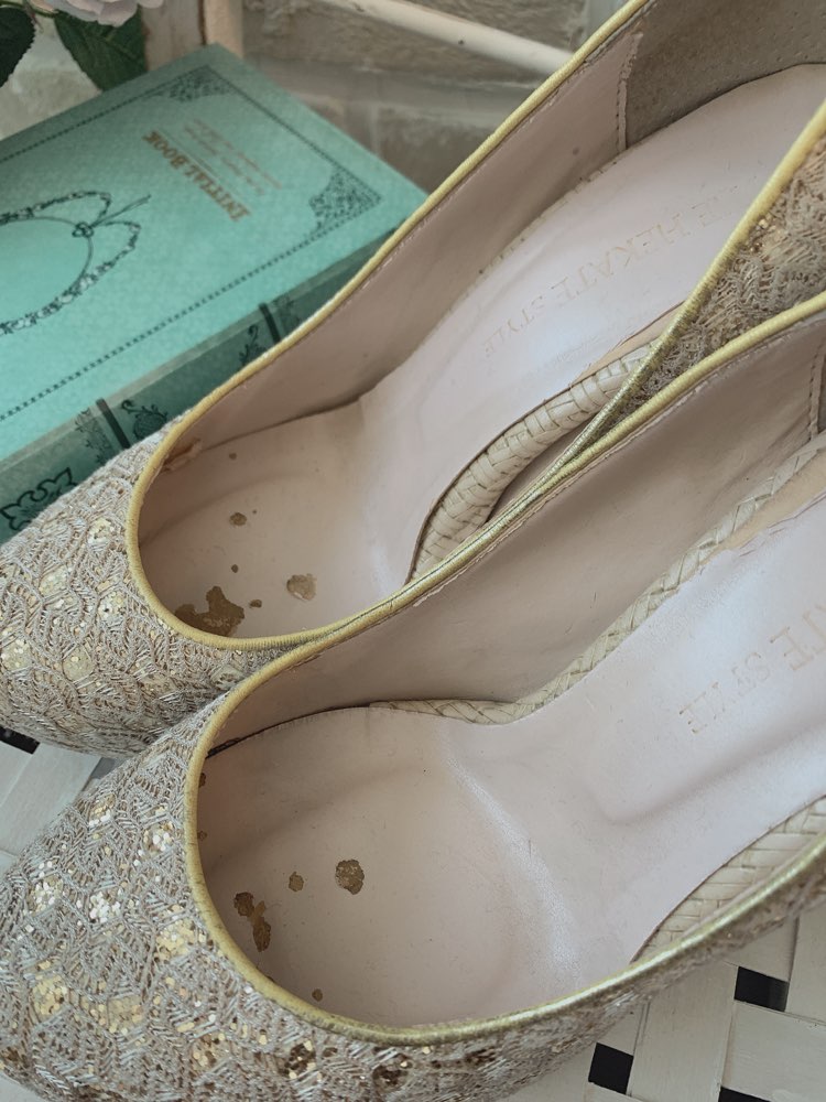 ゴールドラメレースパンプスです。とても履き心地の良いデザインで、普段ヒールを履かない方にも履いて頂けると思います。