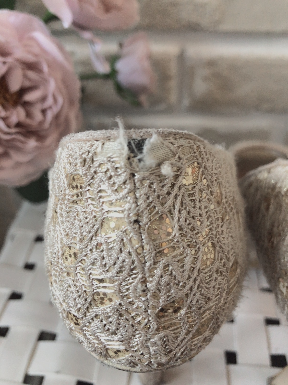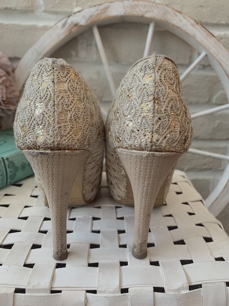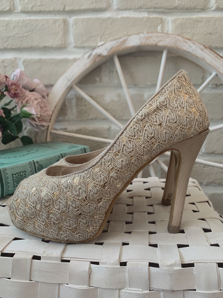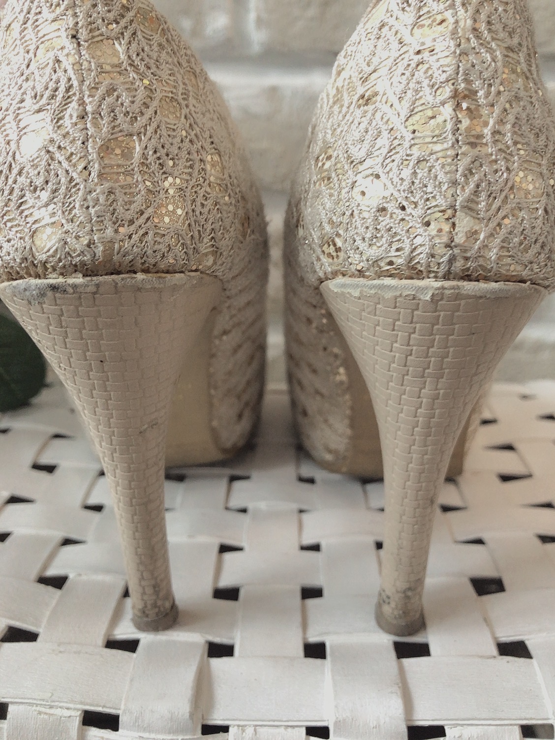 ゴールドラメレースのオープントゥパンプスです。とても履き心地の良いデザインで、普段ヒールを履かない方にも履いて頂けると思います。