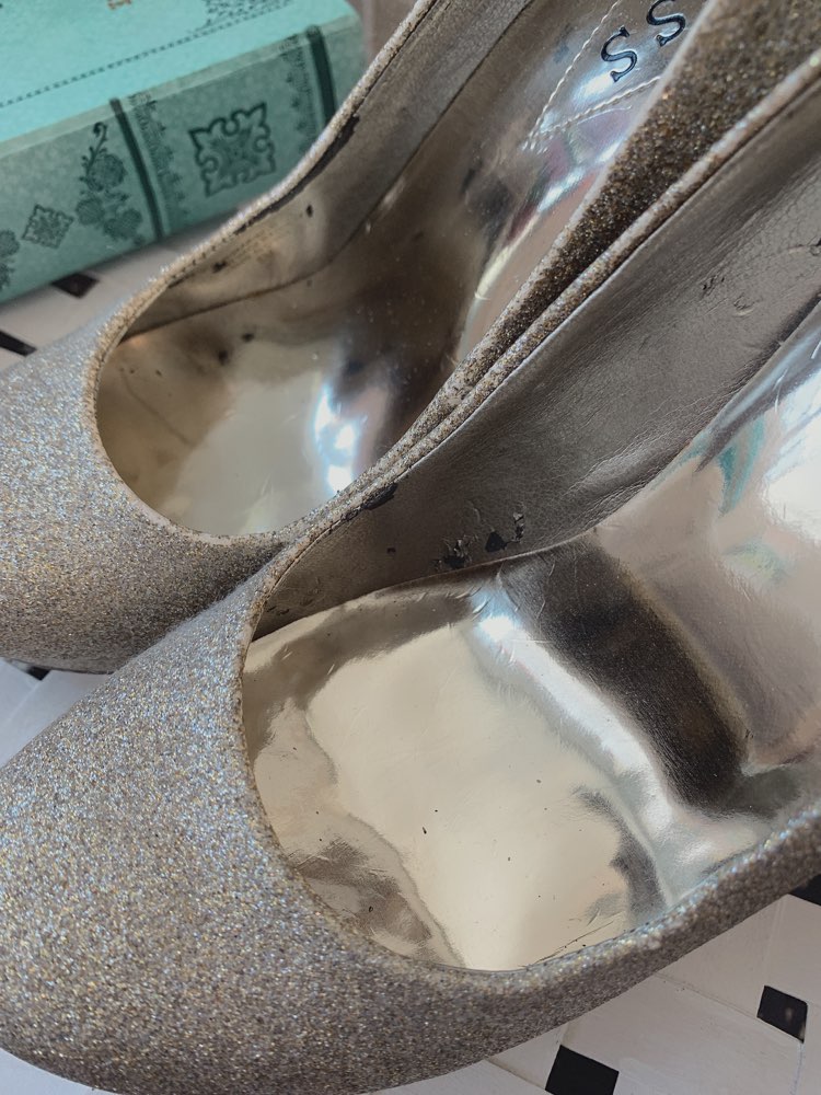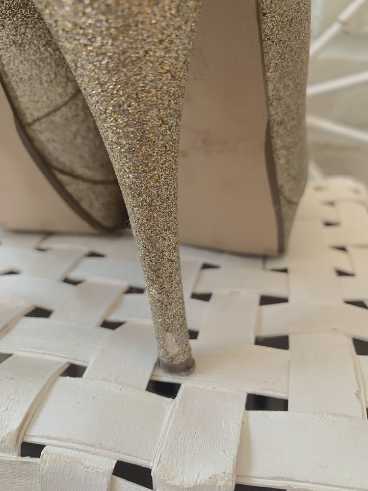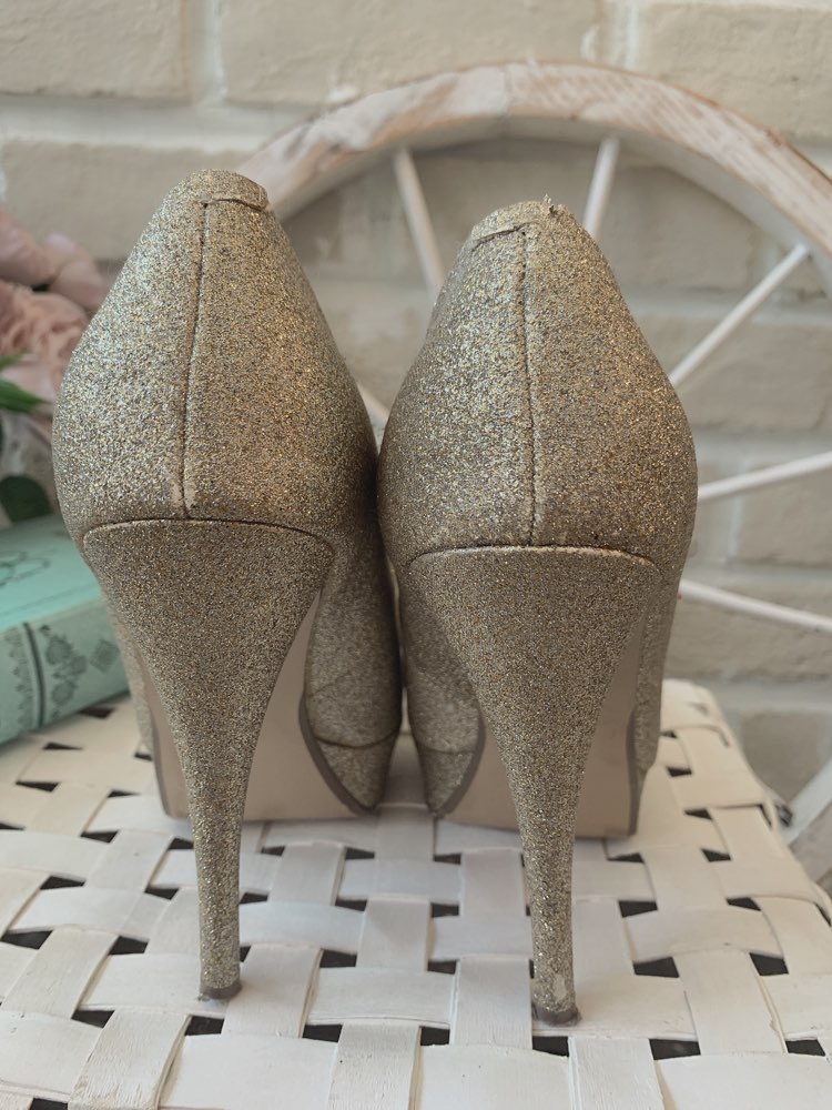 GUESSブランドのゴールドグリッターラメパンプスです。キラキラと輝くので、履いているだけで存在感抜群です。