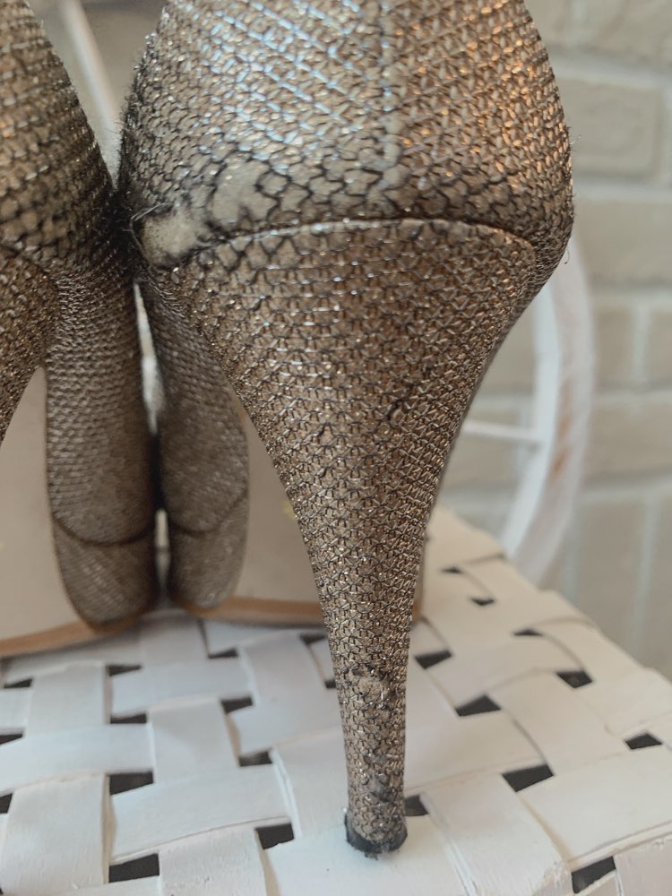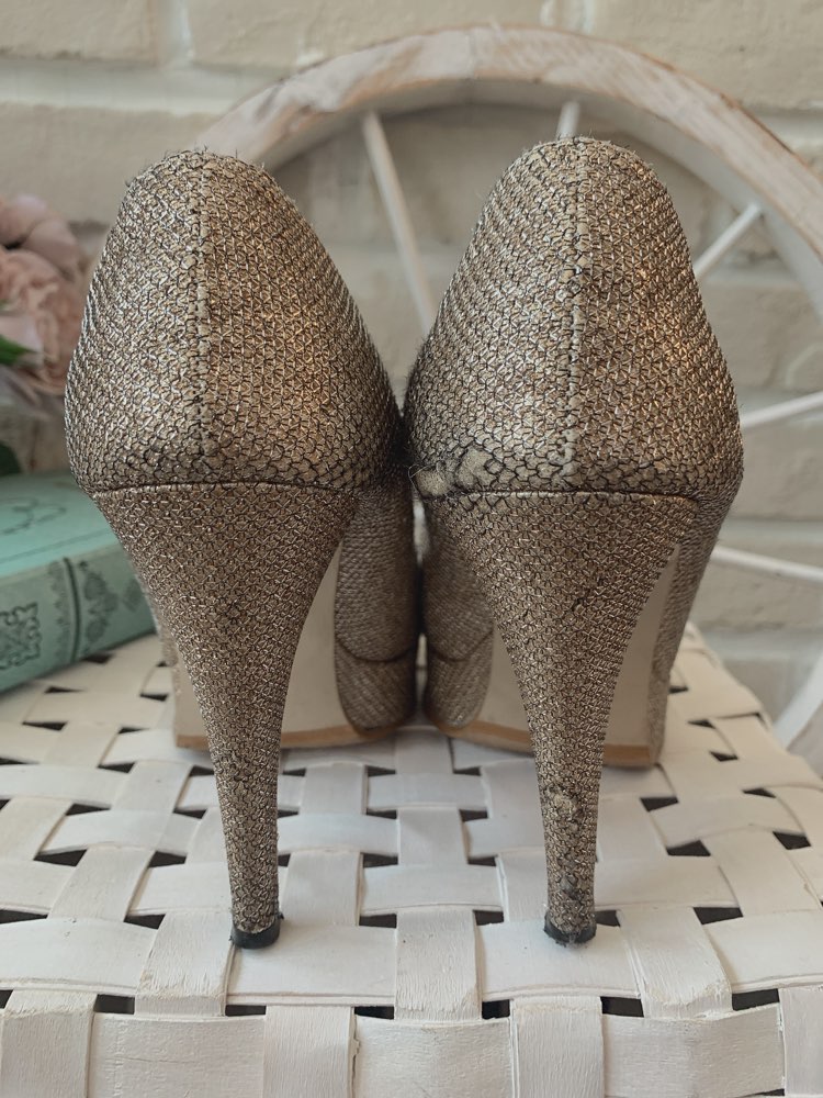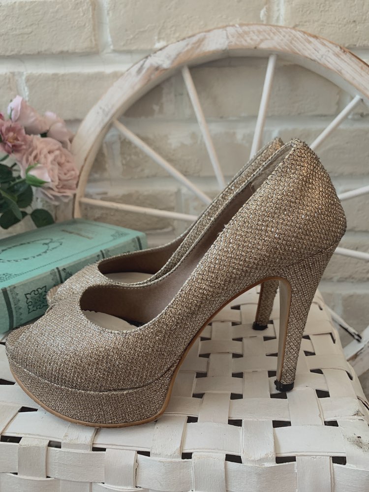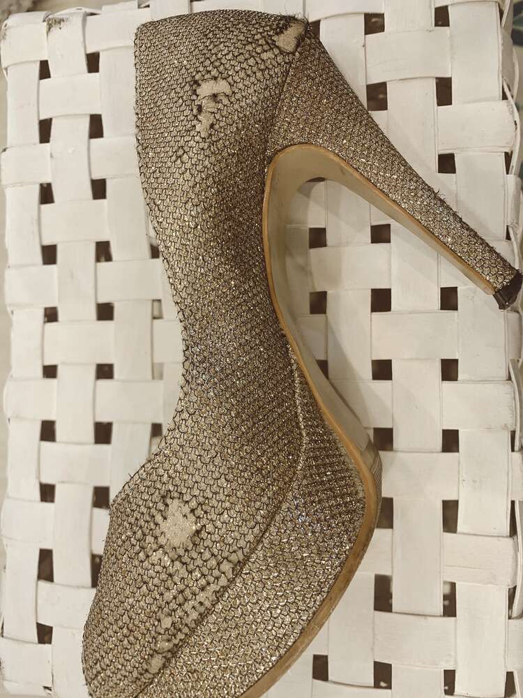ブロンズラメオープントゥパンプスです。キラキラと輝くので、履いているだけで存在感抜群です。