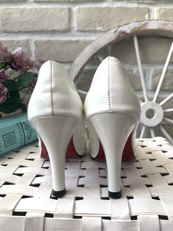 ホワイトエナメルパンプスです。シンプルなデザインでウェディングドレスとの相性抜群です。