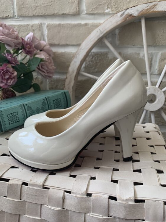 ホワイトエナメルパンプスです。シンプルなデザインでウェディングドレスとの相性抜群です。 ヒールも低めの作りになっておりますので、ヒールが苦手な方にも履いて頂けると思います。 22.0㎝なので、小さめサイズをお探しの方にオススメ。