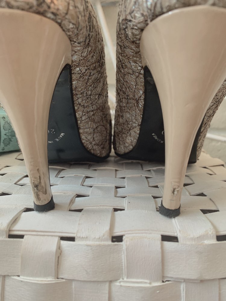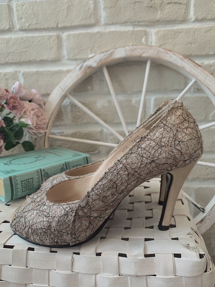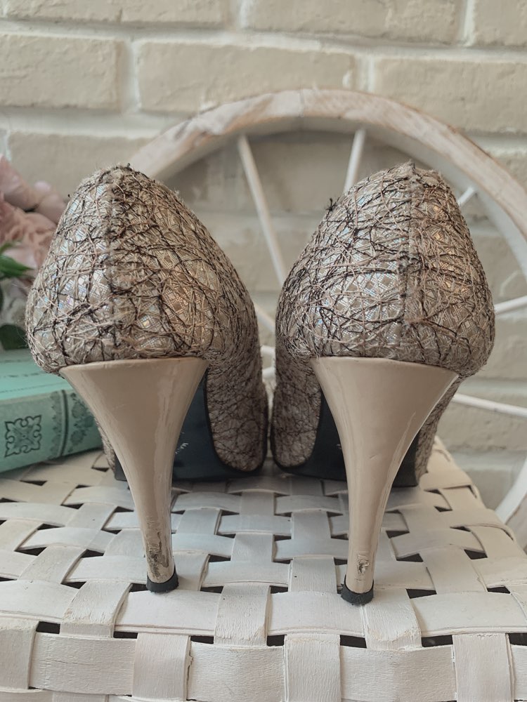 プラチナ錦糸デザインのオープントゥパンプスです。細かな錦糸が混ざり合った大人っぽいデザインになっております。
