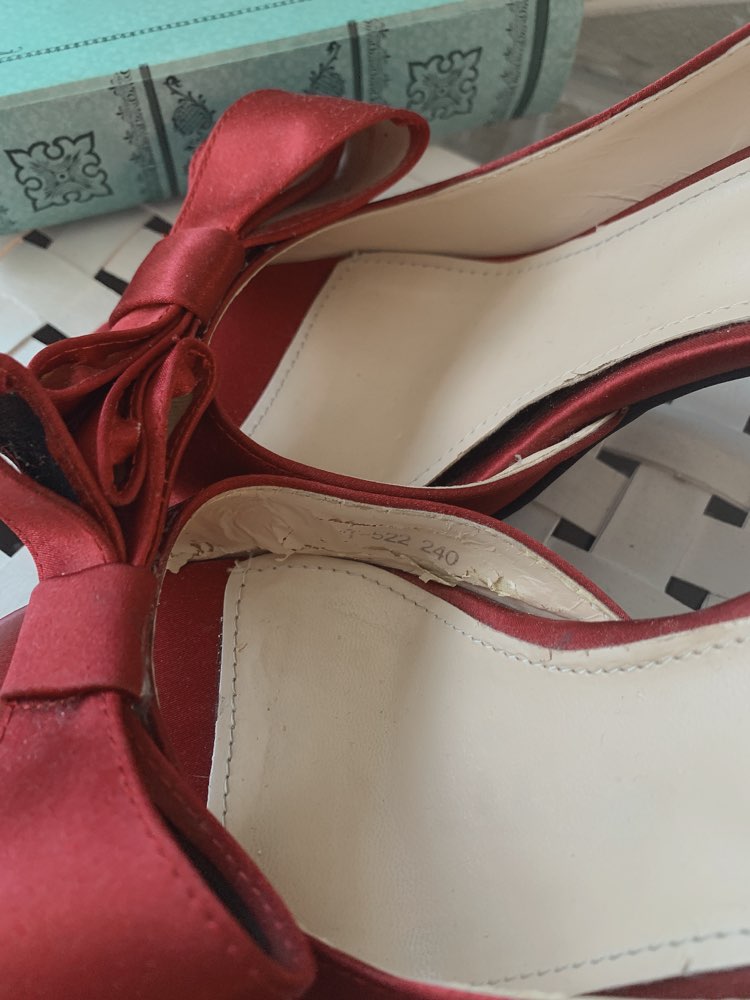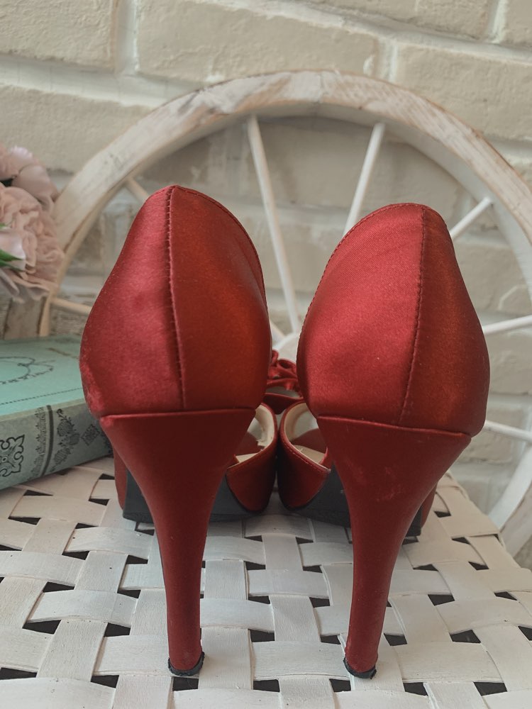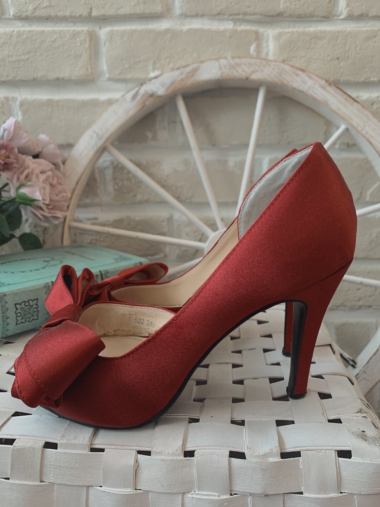 サテン素材のワインレッドオープントゥ大きめリボンが可愛らしいパンプスです。