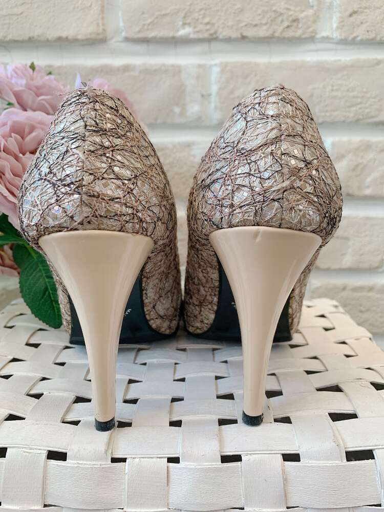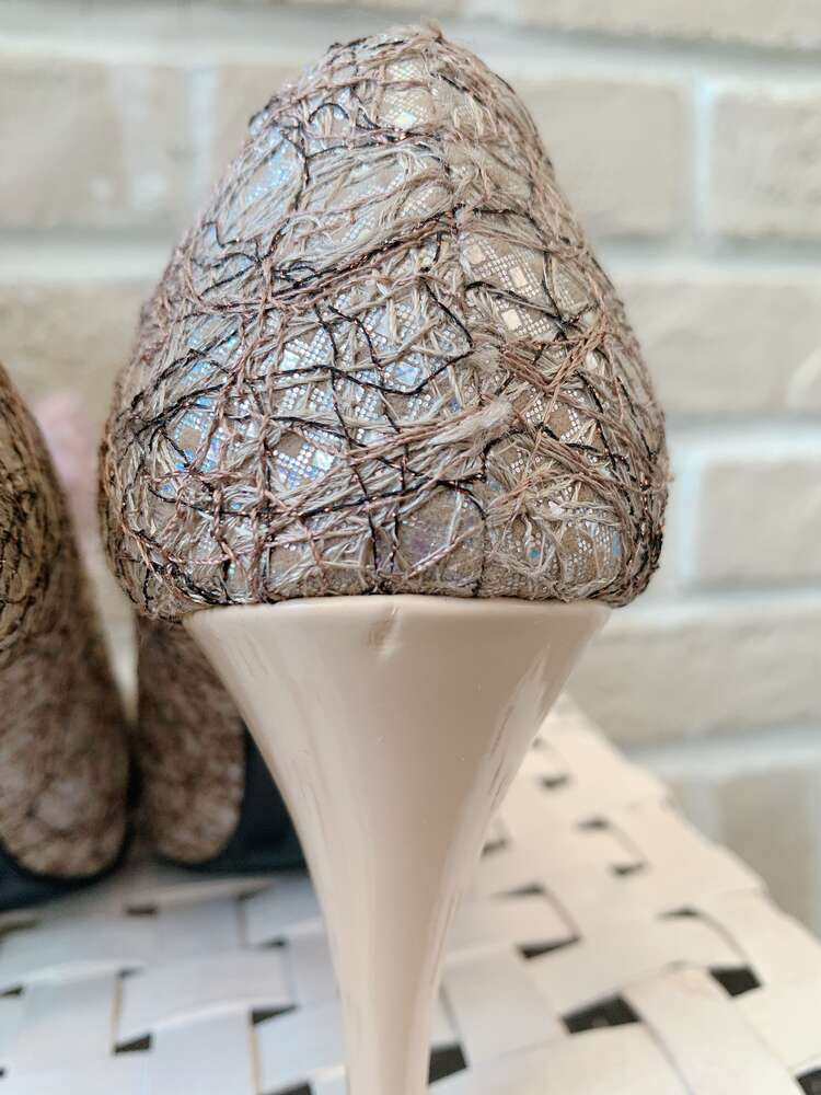 プラチナ錦糸デザインのオープントゥパンプスです。細かな錦糸が混ざり合った大人っぽいデザインになっております。