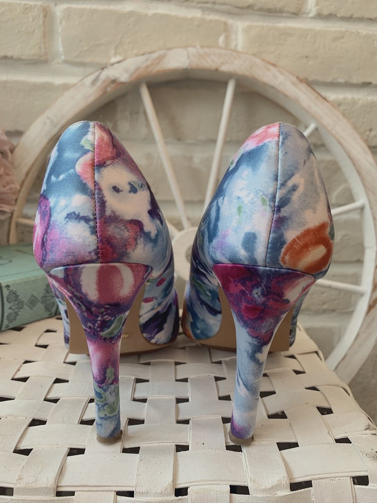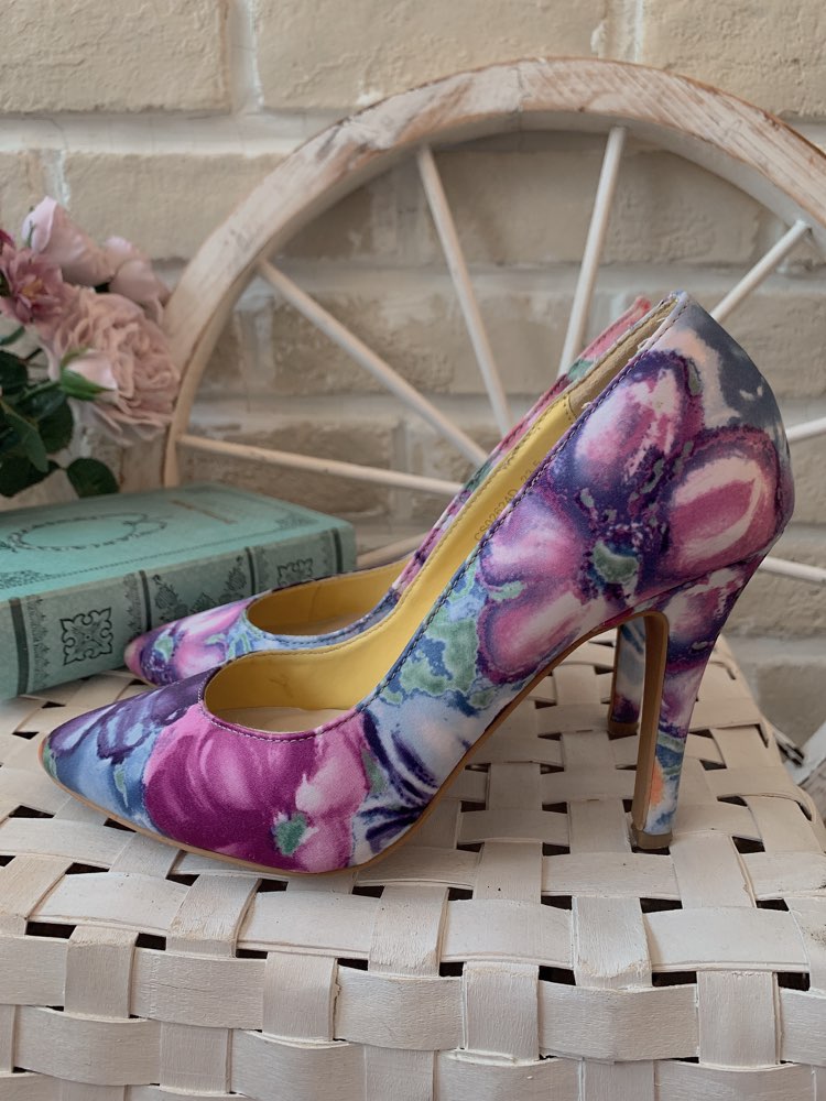 ブルーとパープルの水彩花柄にイエローがワンポイントで目を引くパンプスです。