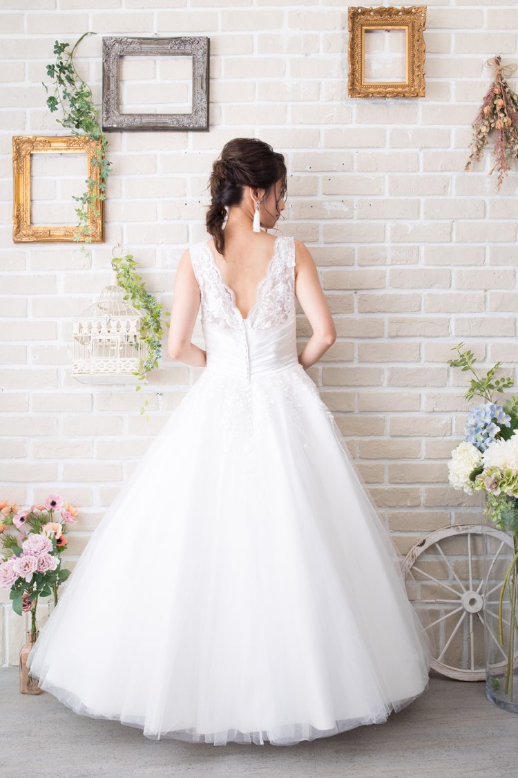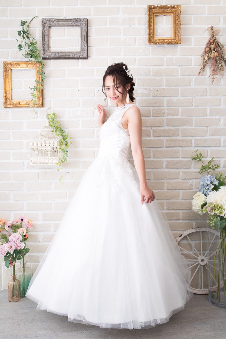 レースとチュール素材のノースリーブタイプボリュームドレスです。 後ろ部分はファスナーが付いているので簡単にお着替え頂けます。 肩ありタイプのドレスなので、落ちてくる心配もございません。 パニエを入れて頂くとふんわりとボリュームが出て、裾部分の丈も上がる為お付け頂くことをお勧めしております。 ※モデルはパニエを着用しております。