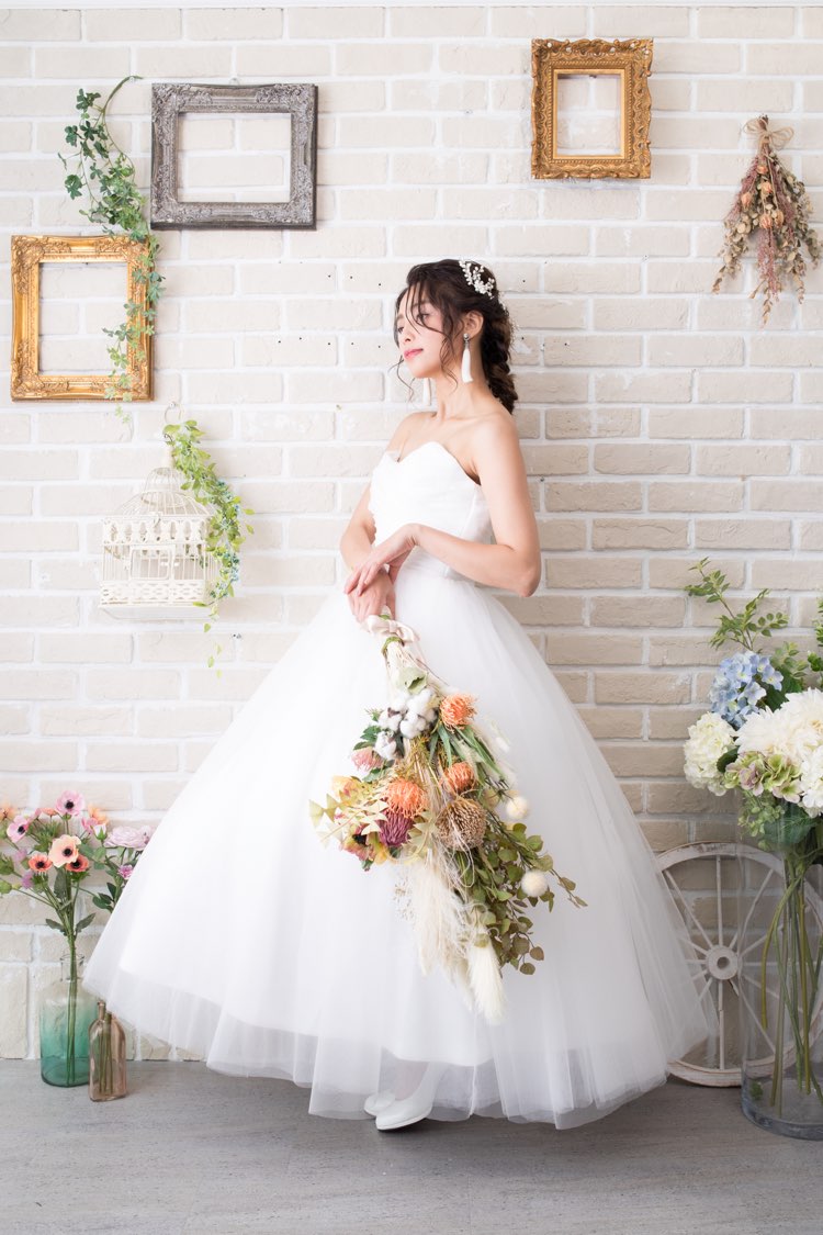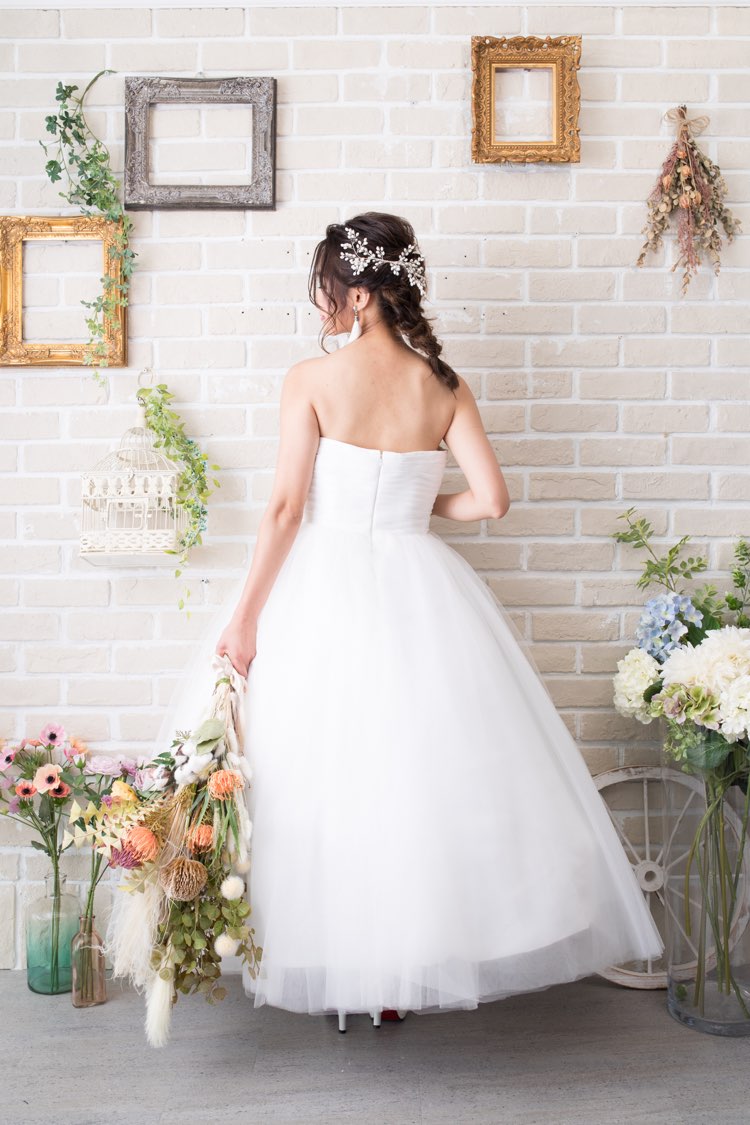シンプルなホワイトカラーのボリュームのあるアンクル丈ドレスです。 後ろ部分はファスナーが付いているので簡単にお着替え頂けます。 お好みで透明ストラップも付けられるので、落ちてくる心配もございません。 パニエを入れて頂くとふんわりとボリュームが出て、裾部分の丈も上がる為お付け頂くことをお勧めしております。 ※モデルはパニエを着用しております。