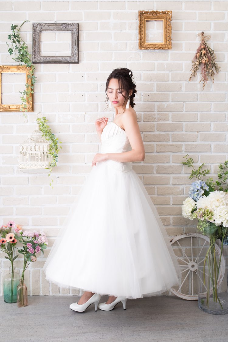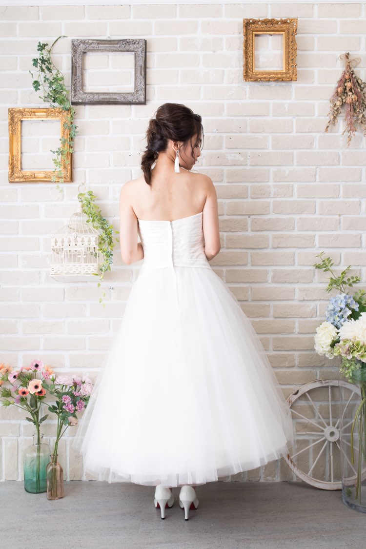 ホワイトのシンプルなアンクル丈ドレスです。 後ろ部分はファスナーが付いているので簡単にお着替え頂けます。 お好みで透明ストラップも付けられるので、落ちてくる心配もございません。 パニエを入れて頂くとふんわりとボリュームが出て、裾部分の丈も上がる為お付け頂くことをお勧めしております。 ※モデルはパニエを着用しております。