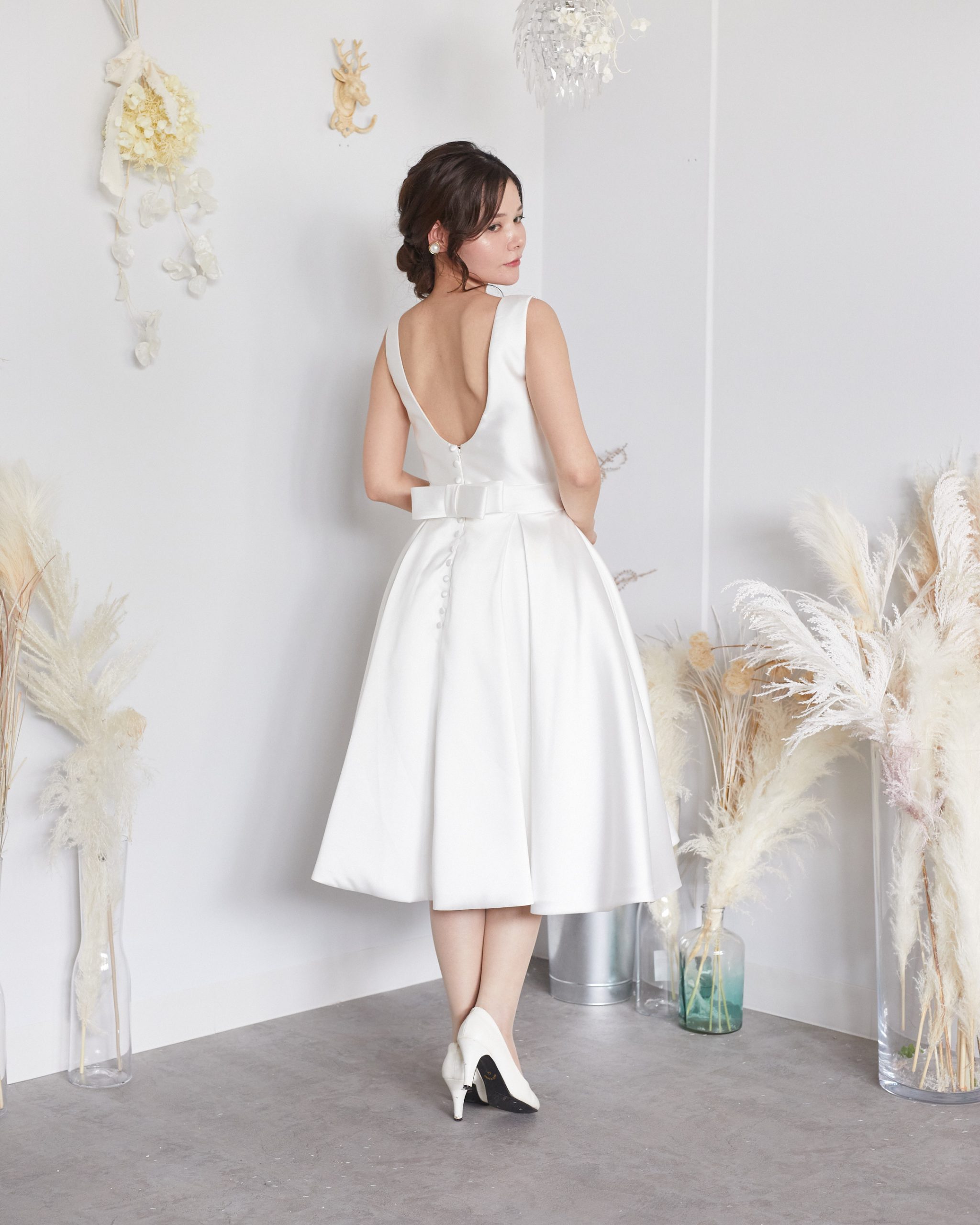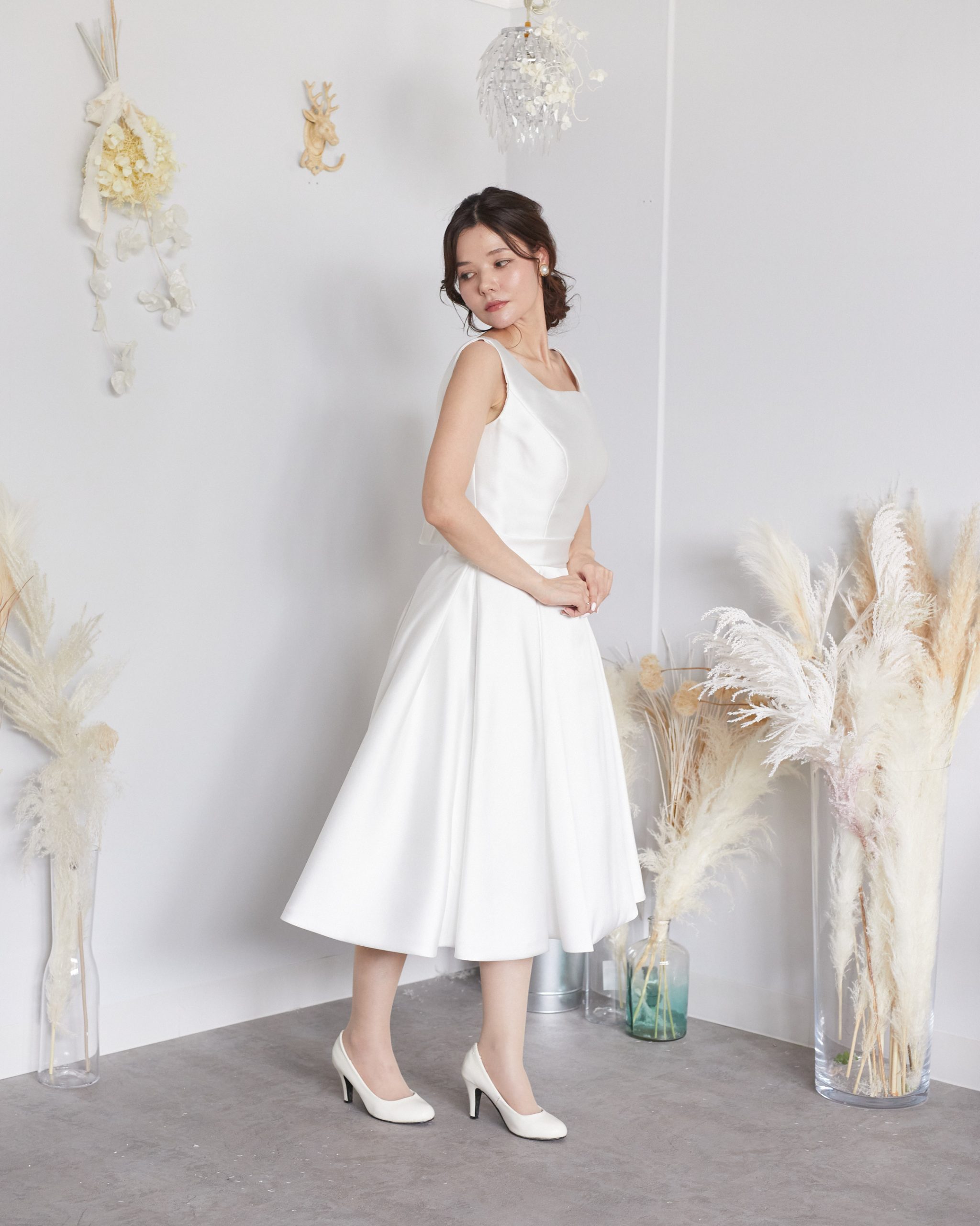 純白クラシカルデザインノースリーブミモレ丈ドレス