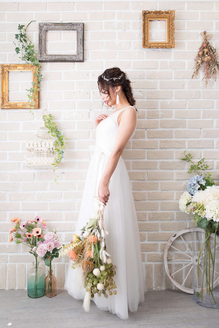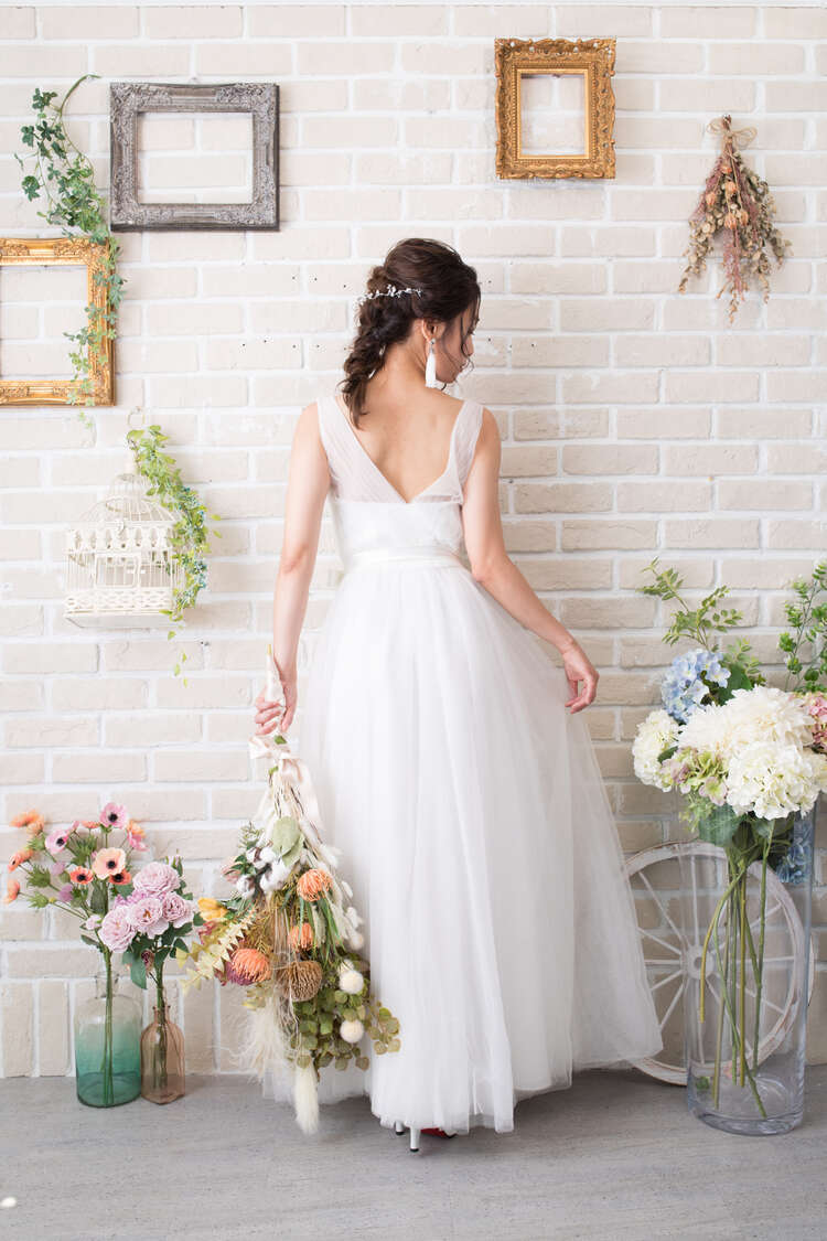 肩ありタイプのドレスなので、落ちてくる心配もございません。