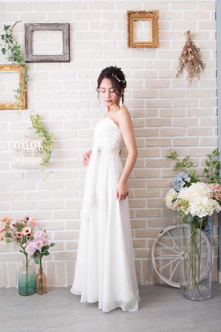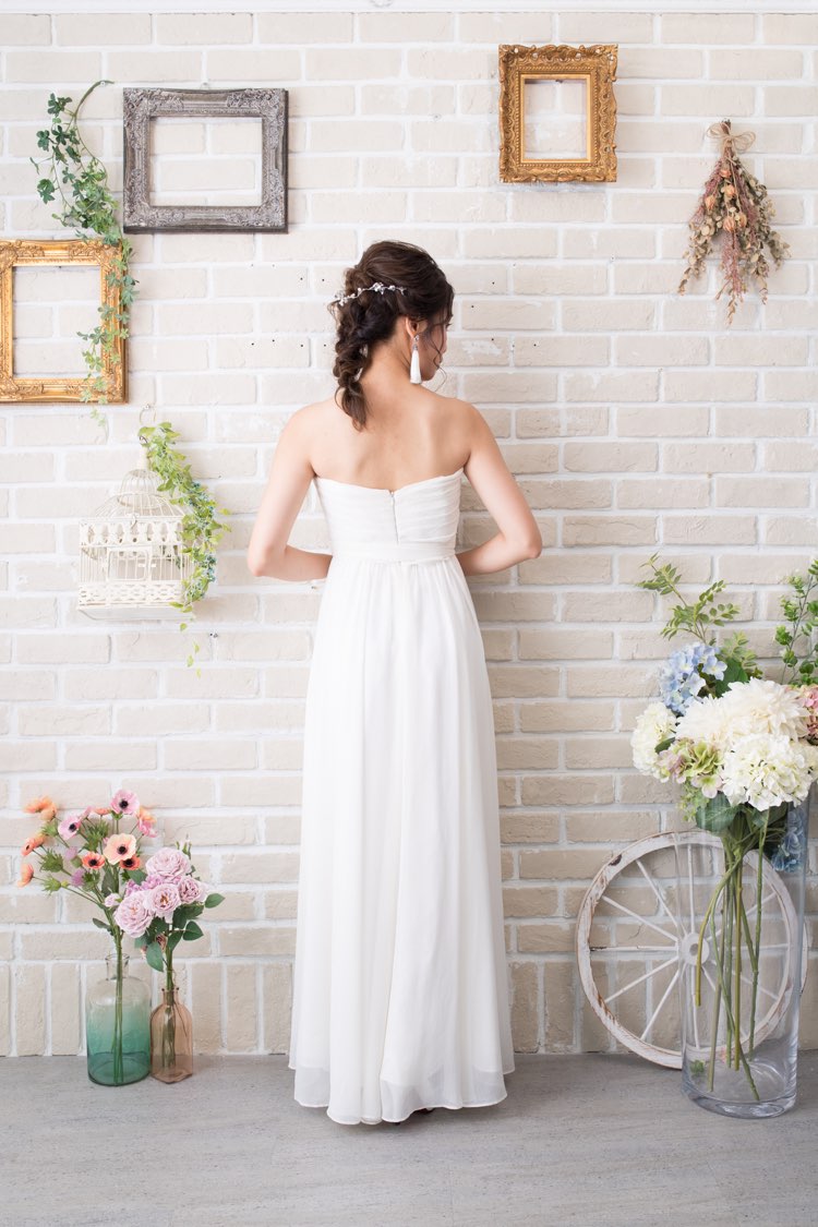 ホワイトのシンプルなハートカットエンパイアラインドレスです。 後ろ部分はファスナーが付いているのでお1人様でも簡単にお着替え頂けます。 お好みで透明ストラップも付けられるので、落ちてくる心配もございません。
