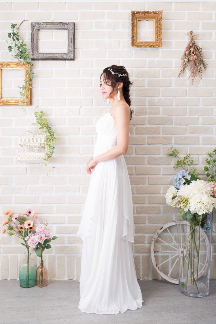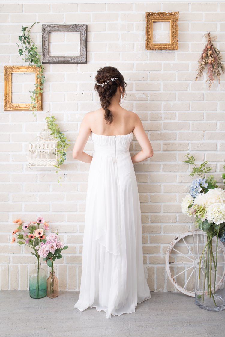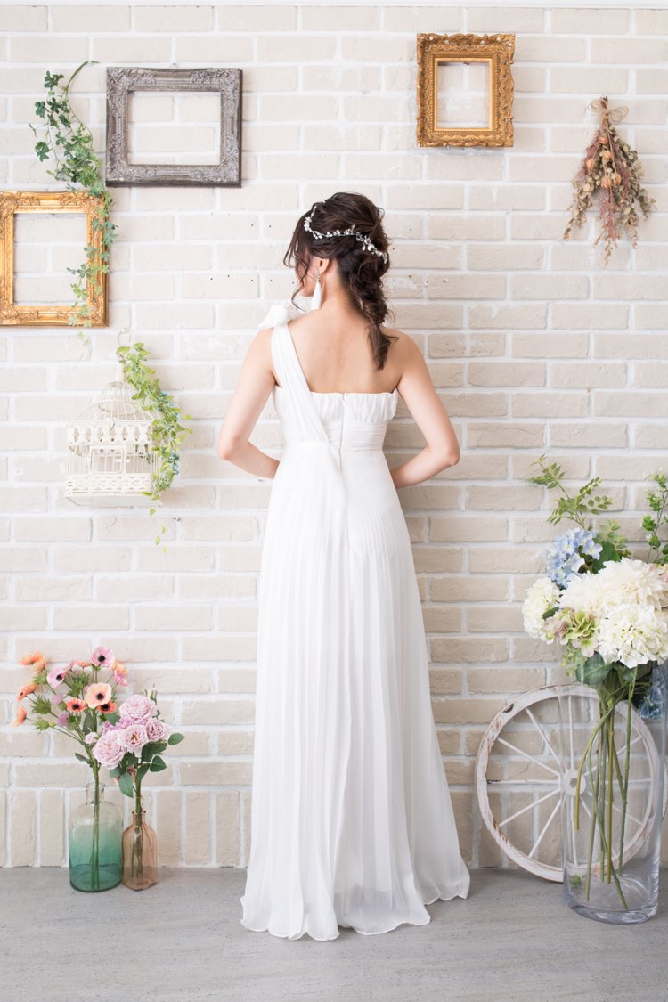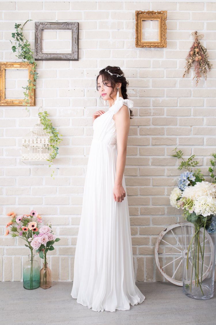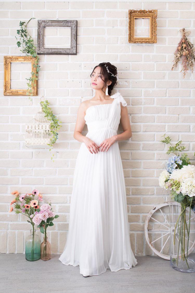 純白プリーツが可愛い2WAYのスリーブロングドレスです。後ろ部分にファスナーが付いているので簡単にお着替え頂けます。 お好みで透明ストラップも付けられるので、落ちてくる心配もございません。 ウエストの紐は、肩の位置で結んで頂くとワンショルダーになり、ウエスト部分で結んで頂くとサッシュベルトのようなリボンにもなるので1着で2度、ドレスのデザインをお楽しみいただけます。