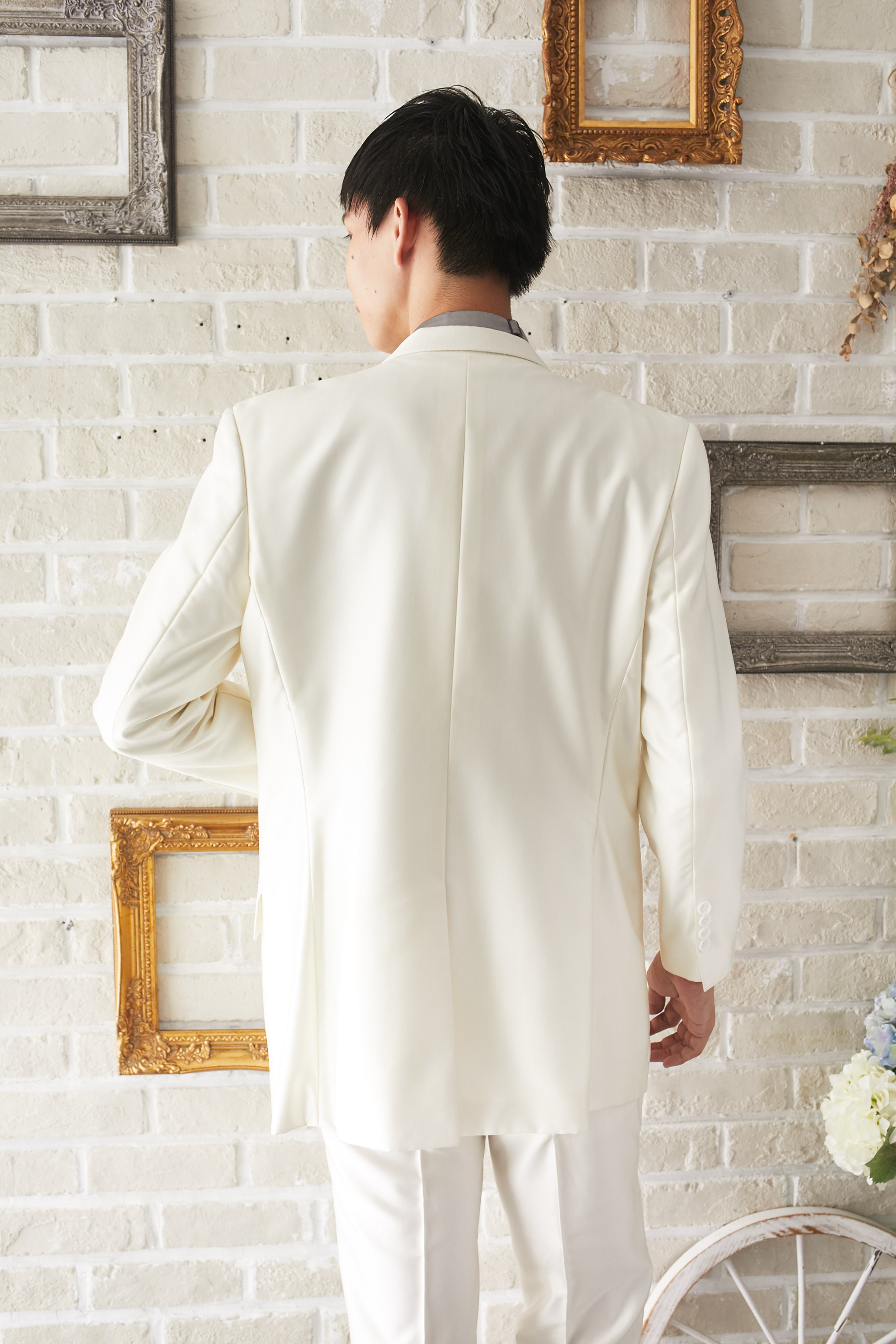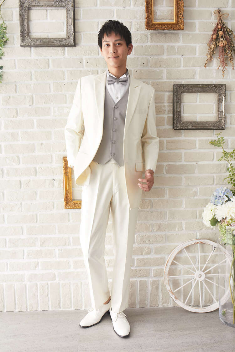 主役感あるホワイトのあるタキシードジャケットです。下襟の先がとがったピークドラぺルタイプ。ベストはチェックやストライプ柄や、スモーキーピンク、ブラック、ブルーなどのベストを差し色として合わせるのもオススメです。合わせるシャツをチェック、ドット、ストライプ、花柄、ネイビー、ブラック、グレーシャツで合わせてカジュアルな二次会タキシードとしても素敵。また白のウィングカラーシャツを合わせればきちんとした結婚式や披露宴向けのフォーマルなコーディネートになります。二次会ウェディング・海外やフォトウェディング、前撮りにまで幅広いシーンでご使用いただけます。オールシーズンに適してます。