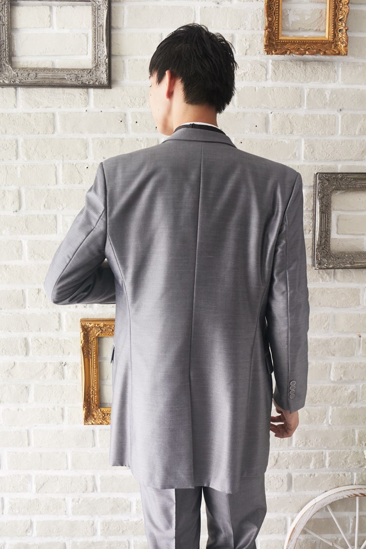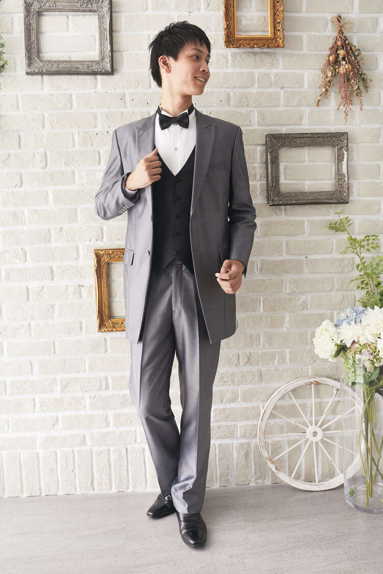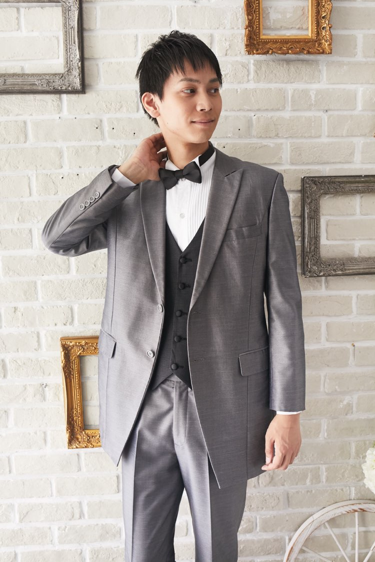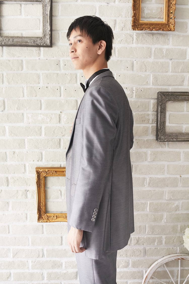 暗めのダークグレーのジャケットです。下襟の先がとがったピークドラぺルタイプ。ジャケット、ベストはチェック柄や、ブラック、ワインレッド、スモーキーピンクカラーなどのベストを差し色として合わせるのもオススメです。合わせるシャツをチェック、ドット、ストライプ、花柄、ネイビー、ブラック、グレーシャツで合わせてカジュアルな二次会タキシードとしても素敵。また白のウィングカラーシャツを合わせればきちんとした結婚式や披露宴向けのフォーマルなコーディネートになります。二次会ウェディング・海外やフォトウェディング、前撮りにまで幅広いシーンでご使用いただけます。結婚式お呼ばれや会社の懇親会などのパーティーにも。オールシーズンに適してます。