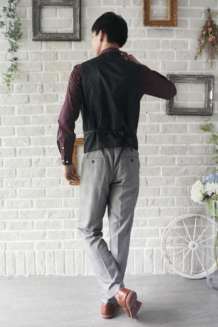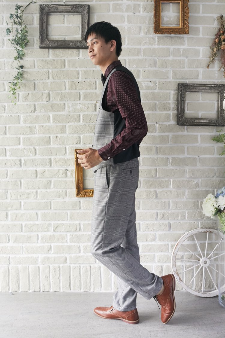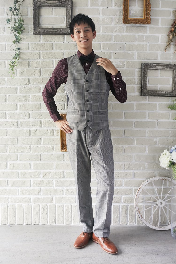 グレーの千鳥格子柄のベストです。シリーズは、ベストとパンツの2ピース展開。グレー、ホワイト、ブラックのオーソドックスなジャケットやパンツはもちろん、ボルドーやパープル、グリーンなどのカラーのとも相性が良いです。また、ネイビー、ボルドー、グレーなどのカラーシャツで合わせればカジュアルな二次会タキシードとしてもオシャレに仕上がります。二次会ウェディング・海外やフォトウェディング、前撮りにまで幅広いシーンでご使用いただけます。結婚式お呼ばれや会社の懇親会などのパーティーにも。オールシーズンに適してます。