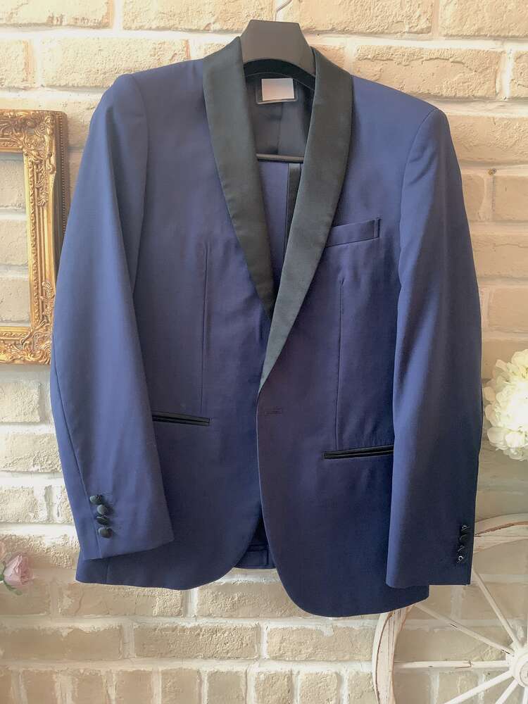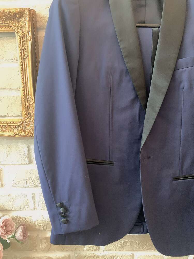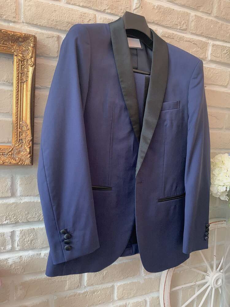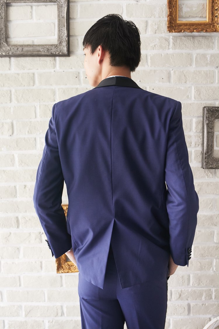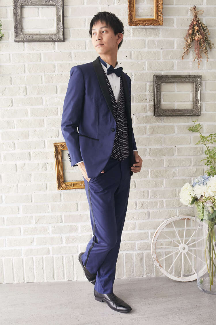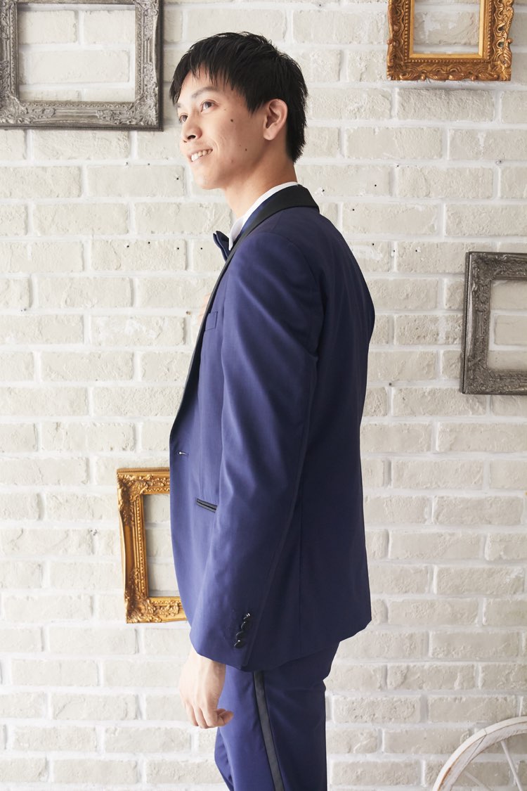 ネイビーブルーのタキシードジャケットです。サテン地のショール・カラータイプ。ジャケット、パンツの2ピースで揃えればシックな装いに。またベストのみチェック柄や、ワインレッドやグレー、ホワイトカラーなどのベストを差し色として合わせるのもオススメです。パンツを白デニムで合わせてもおしゃれです。合わせるシャツを水色やグレーシャツで合わせてカジュアルな二次会タキシードとしても素敵。また白のウィングカラーシャツを合わせればきちんとした結婚式や披露宴向けのフォーマルなコーディネートになります。二次会ウェディング・海外やフォトウェディング、前撮りにまで幅広いシーンでご使用いただけます。結婚式お呼ばれや会社の懇親会などのパーティーにも。オールシーズンに適してます。