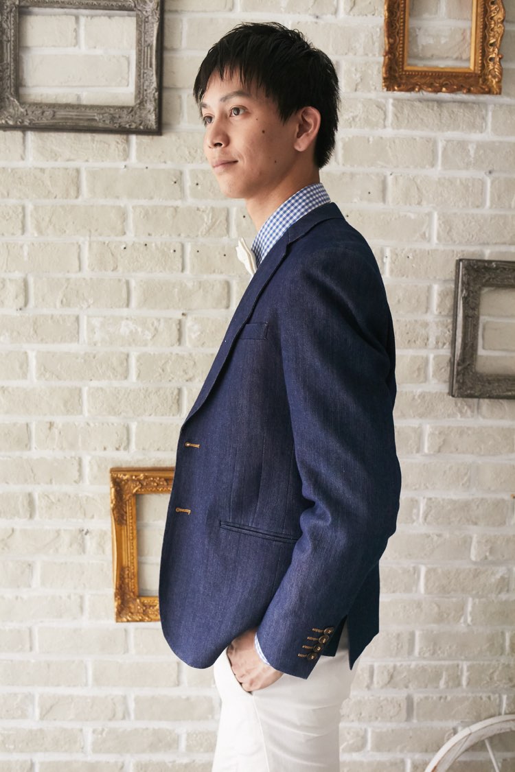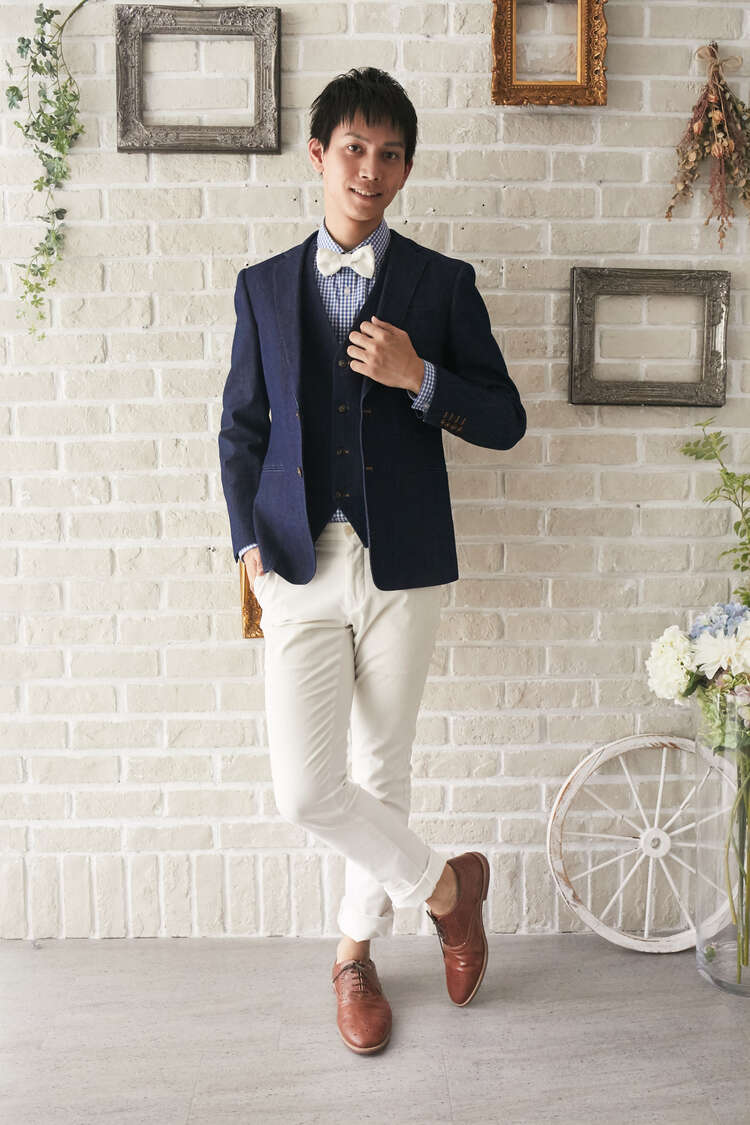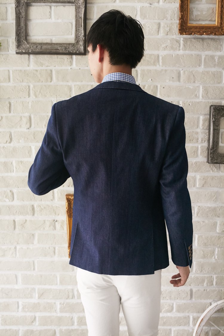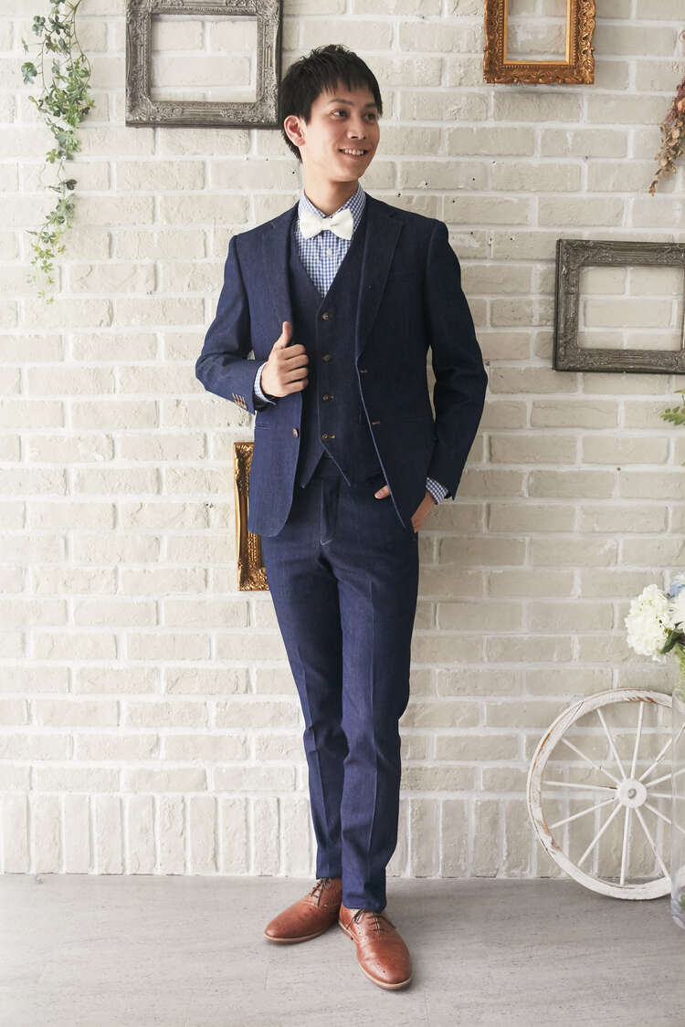 ステッチ入りノンウォッシュデニムのタキシード。ジャケット、ベスト、パンツの3ピースで揃えてもベストのみチャックやカラーベストを差し色として合わせるのもオススメです。パンツを白デニムで合わせてもおしゃれです。合わせるシャツを水色ネイビーのチェックシャツで合わせてカジュアルな二次会タキシードとしても素敵。また白のウィングカラーシャツを合わせればきちんとして爽やかなコーディネートになります。二次会ウェディング・海外やフォトウェディング、前撮りにまで幅広いシーンでご使用いただけます。結婚式お呼ばれや会社の懇親会などのパーティーにも。オールシーズンに適してます。