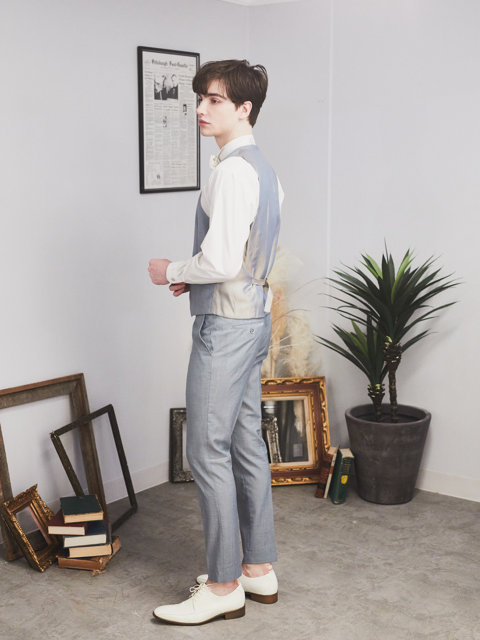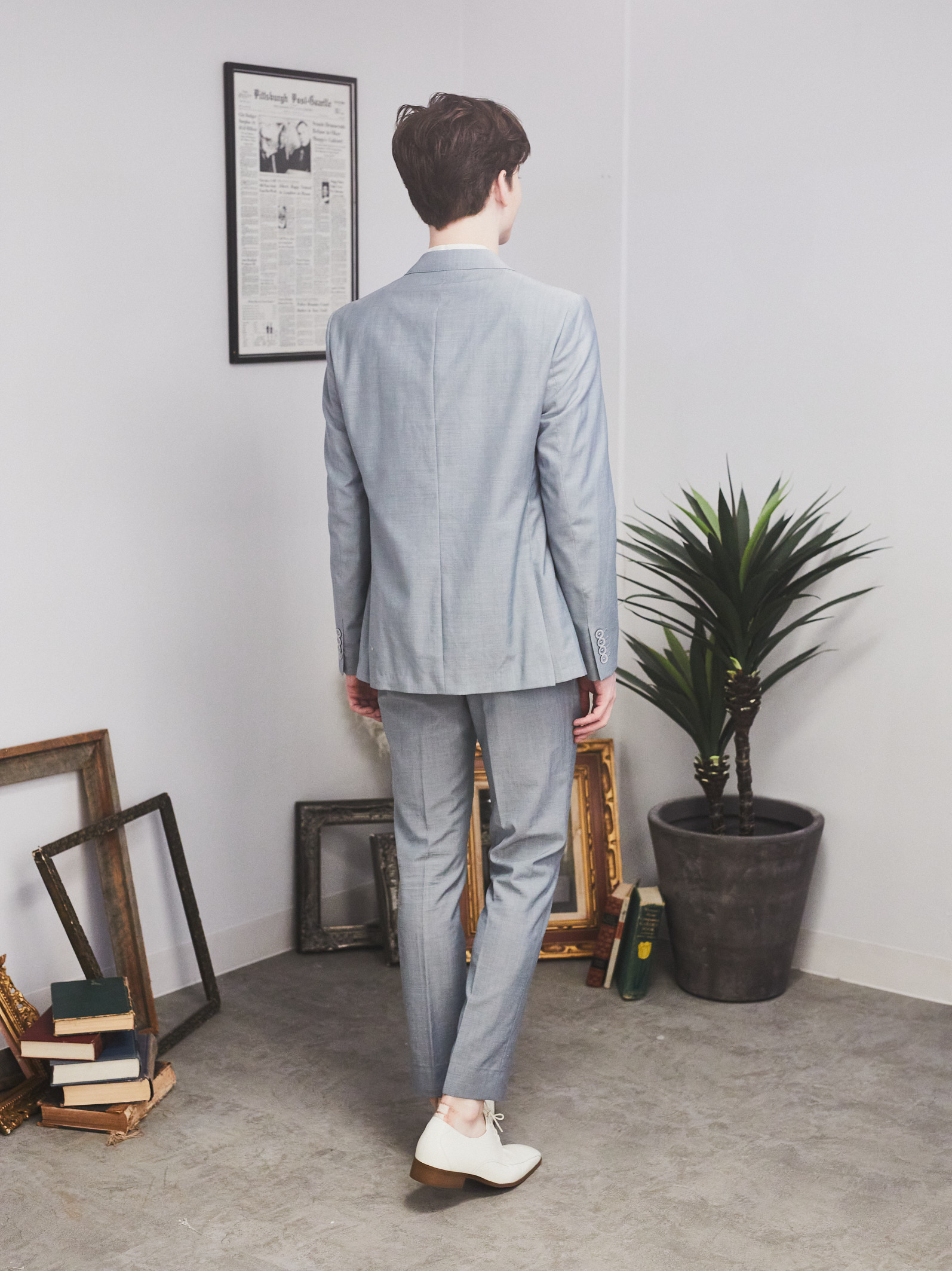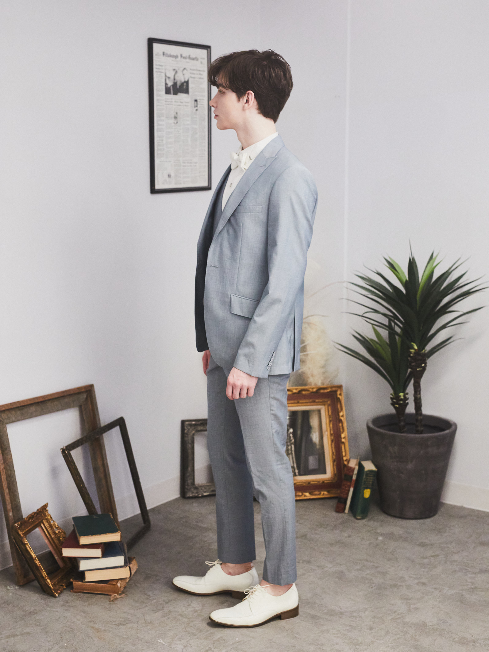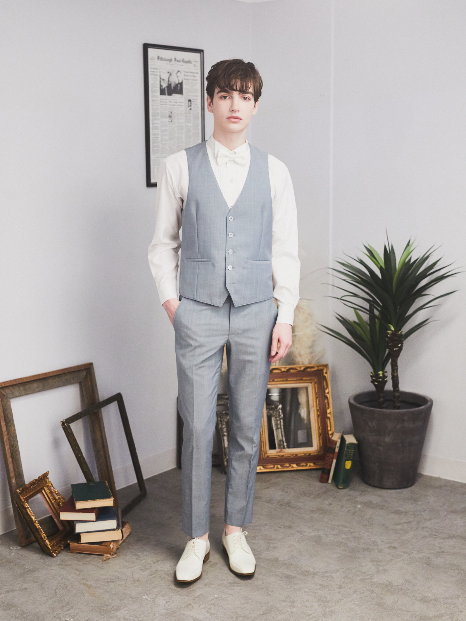 オシャレなダスティーブルーのタキシードジャケットです。同じカラーのベスト、パンツの3ピースでのコーディネートはもちろん、ベストはチェックやストライプ柄や、ワインレッド、ゴールド、シルバー、グレー、スモーキーピンク、ブラック、ブルーなどのベストを差し色として合わせるのもオススメです。合わせるシャツをチェック、ドット、ストライプ、花柄、ネイビー、ブラック、グレーシャツで合わせてカジュアルな二次会タキシードとしても素敵。また白のウィングカラーシャツを合わせればきちんとした結婚式や披露宴向けのフォーマルなコーディネートになります。二次会ウェディング・海外やフォトウェディング、前撮りにまで幅広いシーンでご使用いただけます。結婚式お呼ばれや会社の懇親会などのパーティーにも。オールシーズンに適してます。
