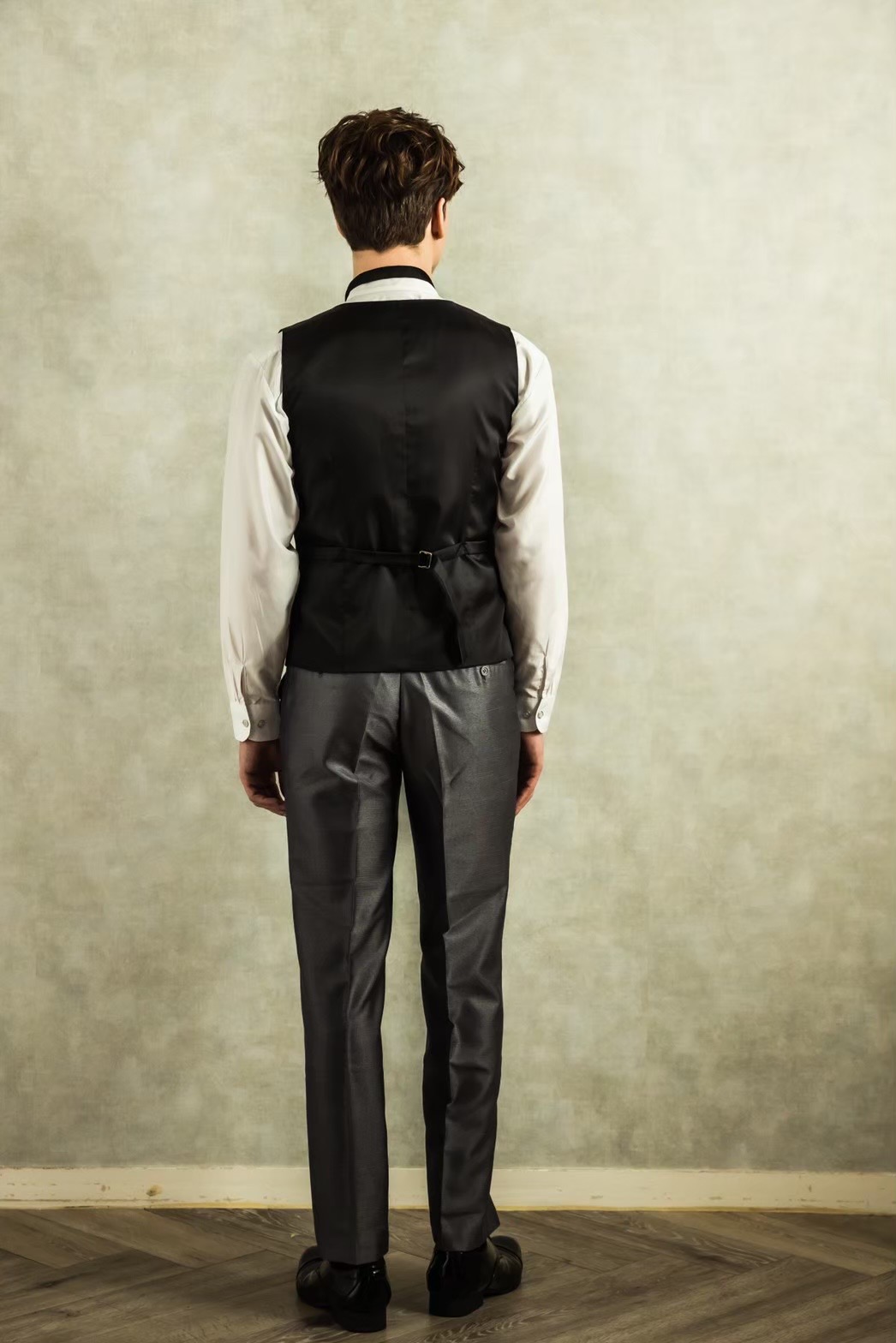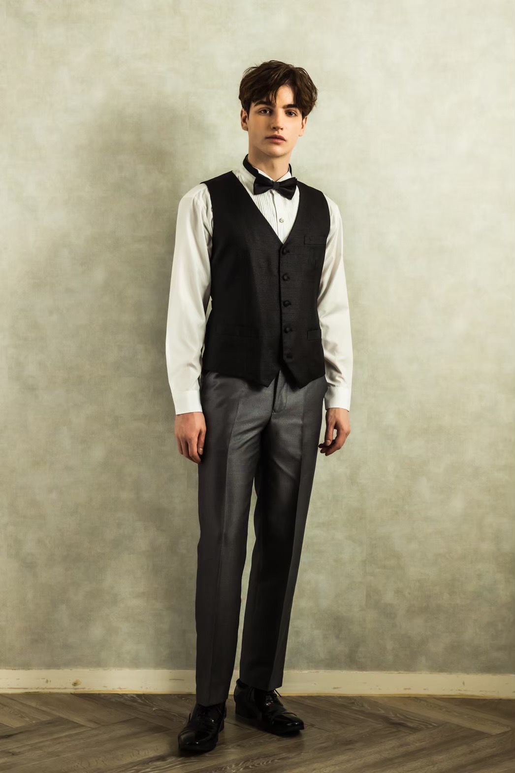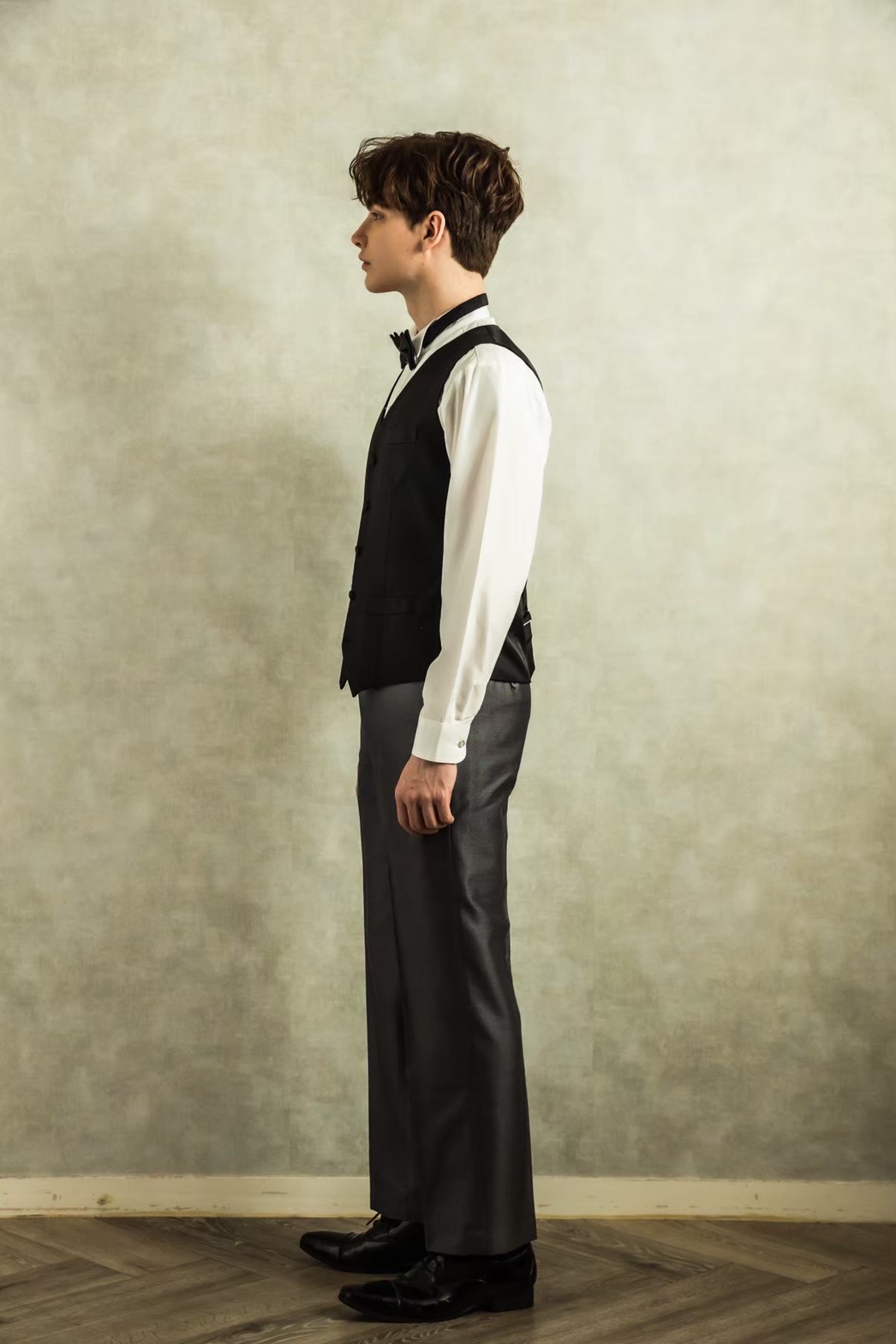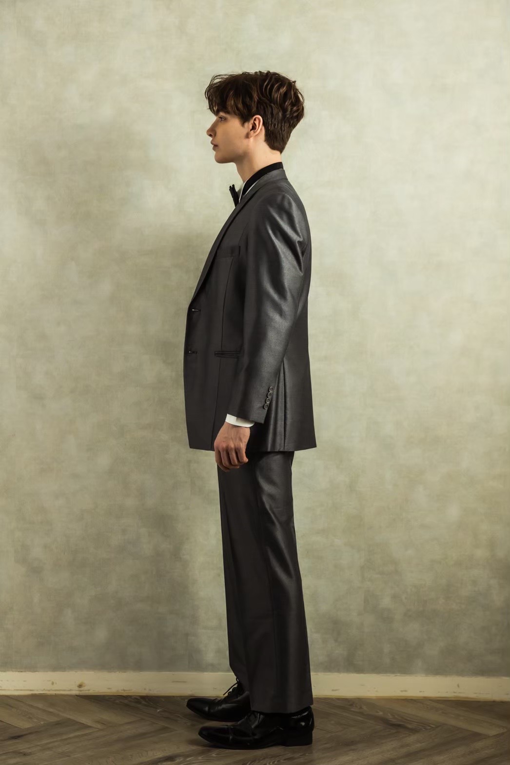 光沢のあるブラックタキシードジャケットです。下襟の先がとがったピークドラぺルタイプ。ベストはチェックやストライプ柄や、ワインレッド、ゴールド、シルバー、グレー、スモーキーピンク、ブラック、ブルーなどのベストを差し色として合わせるのもオススメです。合わせるシャツをチェック、ドット、ストライプ、花柄、ネイビー、ブラック、グレーシャツで合わせてカジュアルな二次会タキシードとしても素敵。また白のウィングカラーシャツを合わせればきちんとした結婚式や披露宴向けのフォーマルなコーディネートになります。二次会ウェディング・海外やフォトウェディング、前撮りにまで幅広いシーンでご使用いただけます。結婚式お呼ばれや会社の懇親会などのパーティーにも。オールシーズンに適してます。
