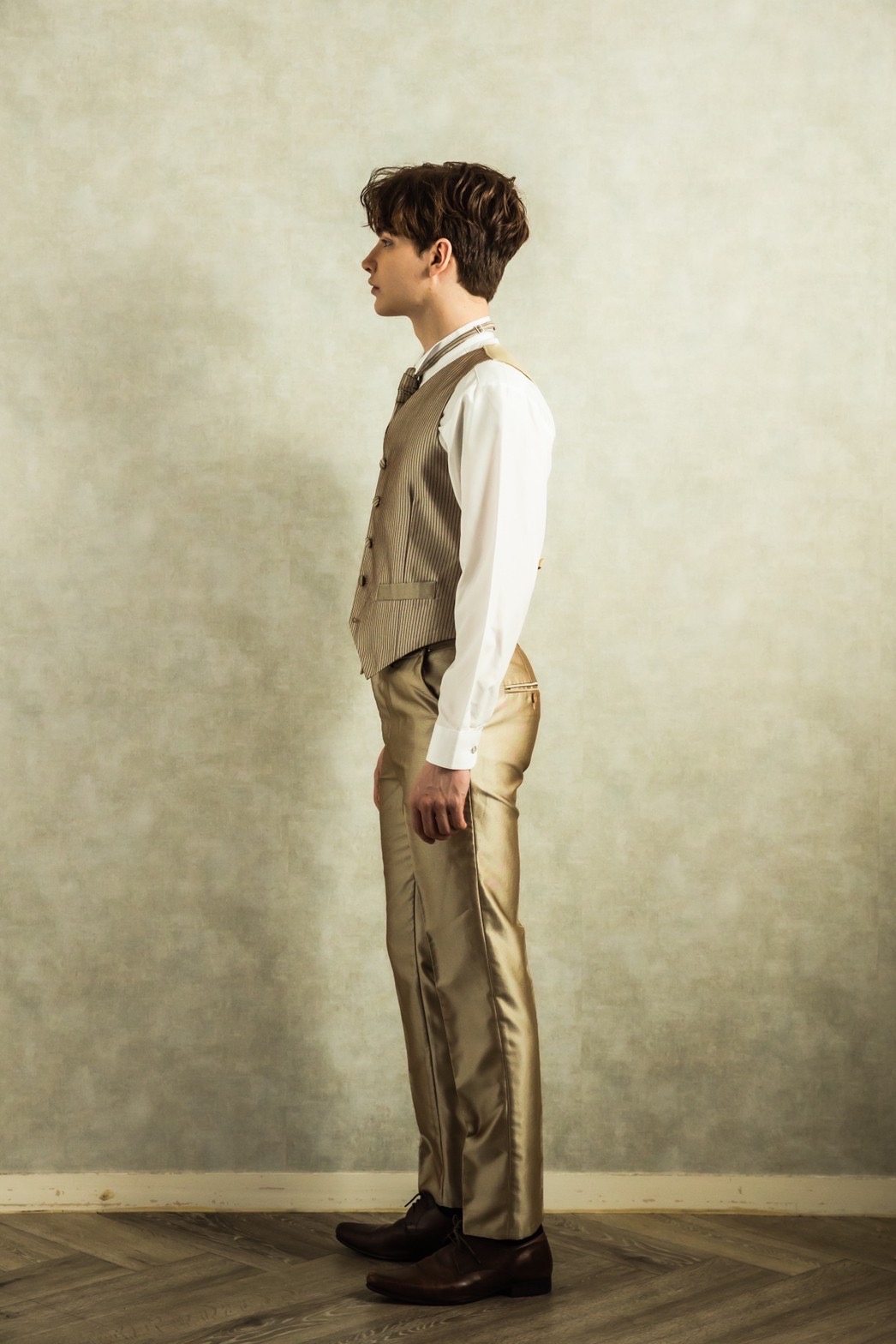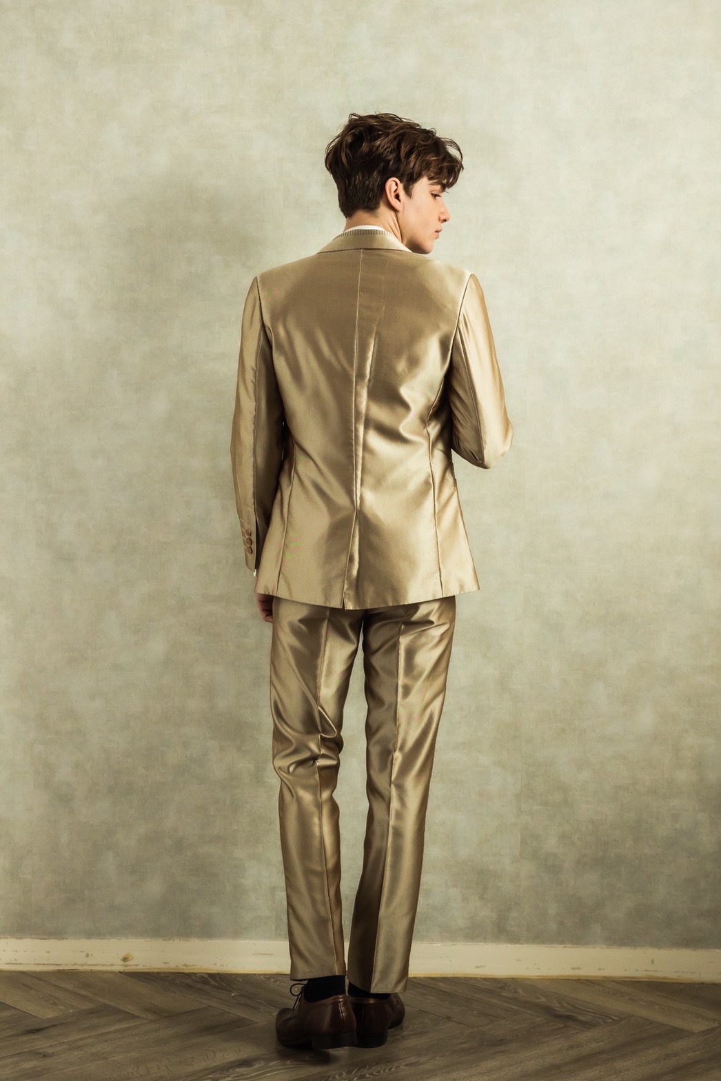光沢のあるゴールドとストライプのタキシードジャケットです。下襟の先がとがったピークドラぺルタイプ。襟やポケット部分にストライプ柄が入っていて、フォーマルにもカジュアルにも着こなせます。セットのベストと合わせるのもオススメです。合わせるシャツをストライプ、ボルドー、ブラック、ネイビーシャツで合わせてカジュアルな二次会タキシードとしても素敵。また白のウィングカラーシャツを合わせればきちんとした結婚式や披露宴向けのフォーマルなコーディネートになります。結婚式・披露宴・パーティー・二次会ウェディング・海外やフォトウェディング、前撮りにまで幅広いシーンでご使用いただけます。オールシーズンに適してます。