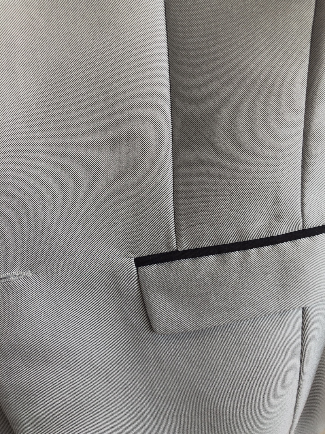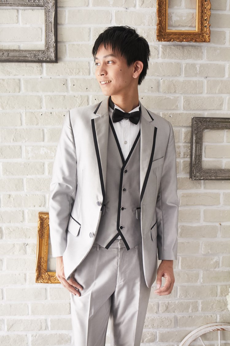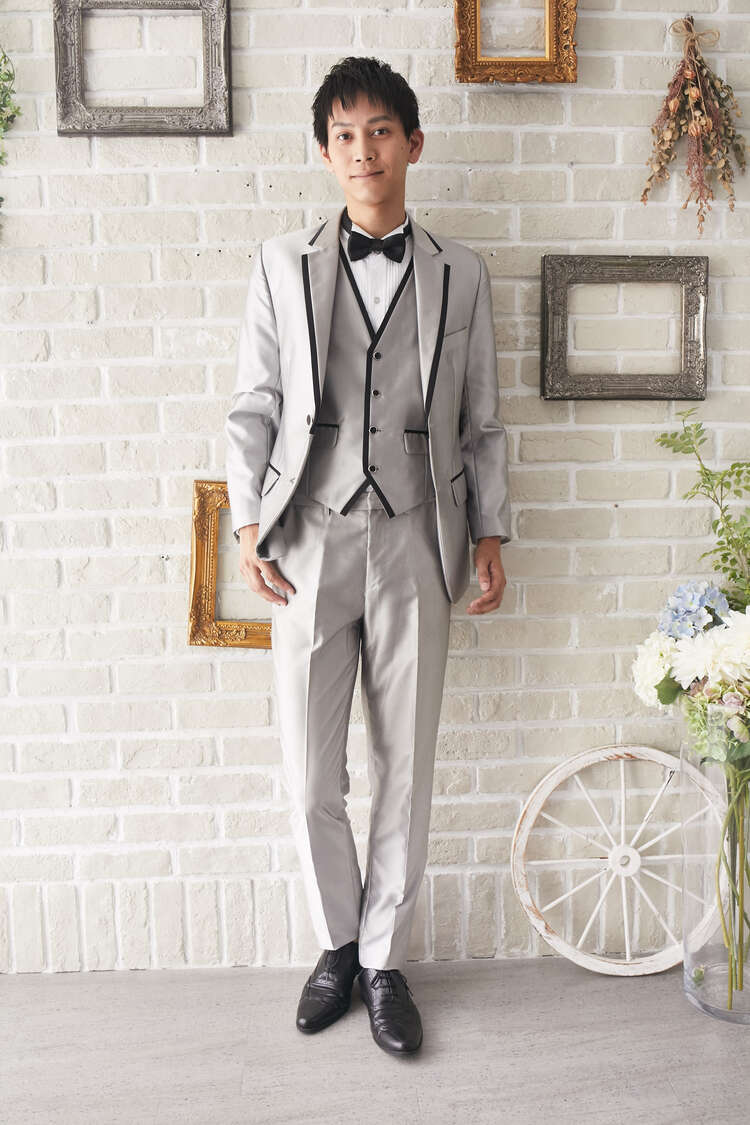 グレーシルバーのブラックのパイピングタキシードジャケットです。下襟の先がとがったピークドラぺルタイプ。ジャケット、ベスト、パンツの3ピースタイプ。ベストはチェック柄や、ブラック、ワインレッド、スモーキーピンクカラーなどのベストを差し色として合わせるのもオススメです。合わせるシャツをチェック、ドット、ストライプ、花柄、ネイビー、ブラック、グレーシャツで合わせてカジュアルな二次会タキシードとしても素敵。また白のウィングカラーシャツを合わせればきちんとした結婚式や披露宴向けのフォーマルなコーディネートになります。結婚式・披露宴・パーティー・二次会ウェディング・海外やフォトウェディング、前撮りにまで幅広いシーンでご使用いただけます。オールシーズンに適してます。