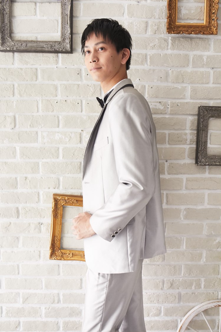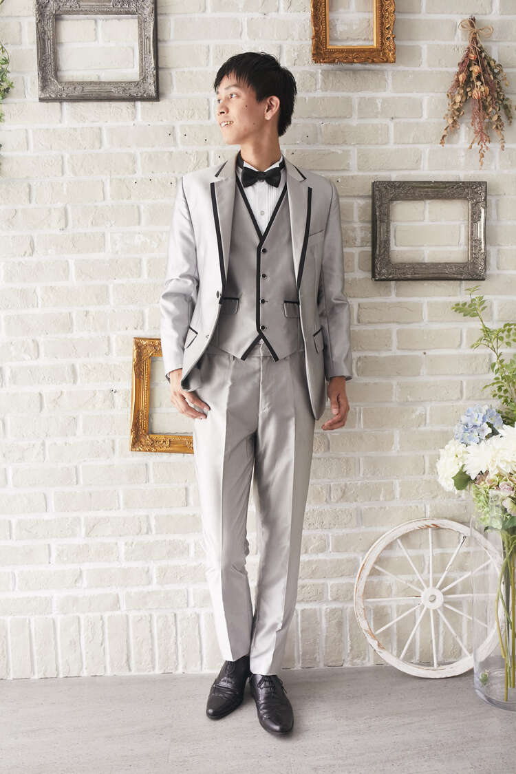 グレーシルバーのブラックのパイピングタキシード。下襟の先がとがったピークドラぺルタイプ。ジャケット、ベスト、パンツの3ピースタイプ。ベストはチェック柄や、ブラック、ワインレッド、スモーキーピンクカラーなどのベストを差し色として合わせるのもオススメです。合わせるシャツをチェック、ドット、ストライプ、花柄、ネイビー、ブラック、グレーシャツで合わせてカジュアルな二次会タキシードとしても素敵。また白のウィングカラーシャツを合わせればきちんとした結婚式や披露宴向けのフォーマルなコーディネートになります。結婚式・披露宴・パーティー・二次会ウェディング・海外やフォトウェディング、前撮りにまで幅広いシーンでご使用いただけます。オールシーズンに適してます。