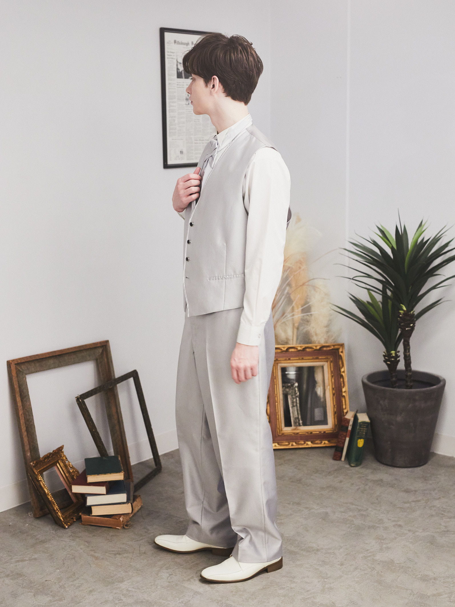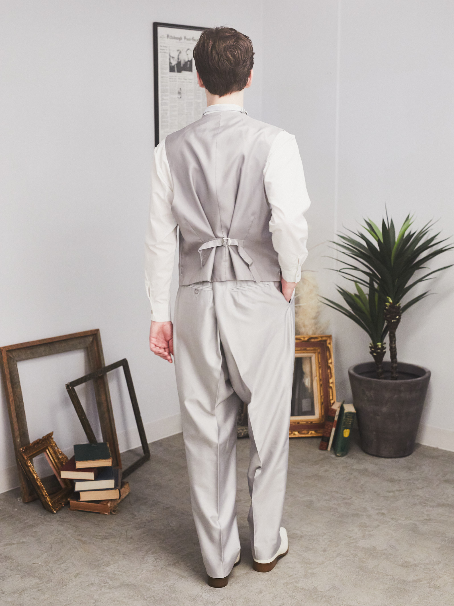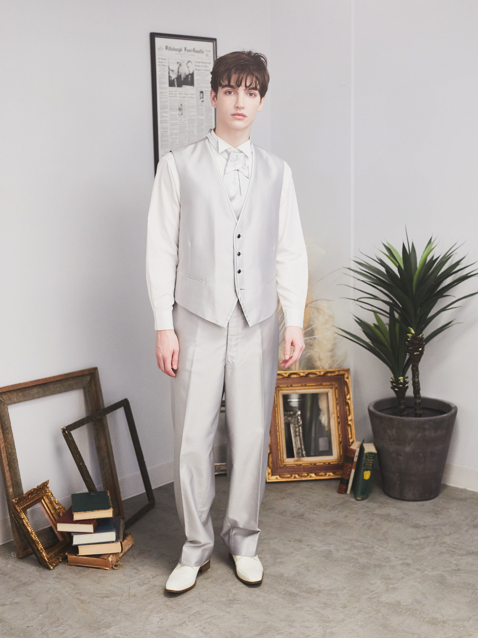 光沢のあるシャイングレーのモーニングコートのジャケットです。下襟の先がとがったピークドラぺルタイプです。モーニングコートは昼間の時間帯で最も格式の高い正礼装です。シングルブレストという生地を重ねないい形でボタンは一つ。きちんと感を大切にされたい新郎様や非日常を味わいたい方にオススメのスタイルです。少しおしゃれなカジュアルに着崩すならベストはチェックやストライプ柄や、ワインレッド、ゴールド、シルバー、グレー、スモーキーピンク、ブラック、ブルーなどのベストを差し色として合わせるのもオススメです。合わせるシャツをチェック、ドット、ストライプ、花柄、ネイビー、ブラック、グレーシャツで合わせてカジュアルな二次会タキシードとしても素敵。また白のウィングカラーシャツを合わせればきちんとした結婚式や披露宴向けのフォーマルなコーディネートになります。会社の懇親会などのパーティーや二次会ウェディング・海外やフォトウェディング、前撮りにまで幅広いシーンでご使用いただけます。オールシーズンに適してます。