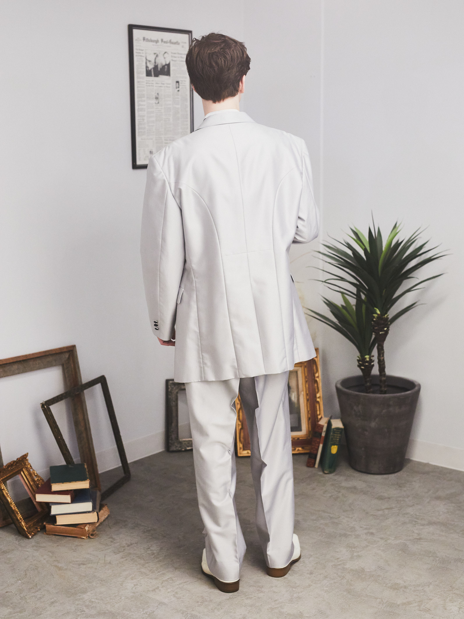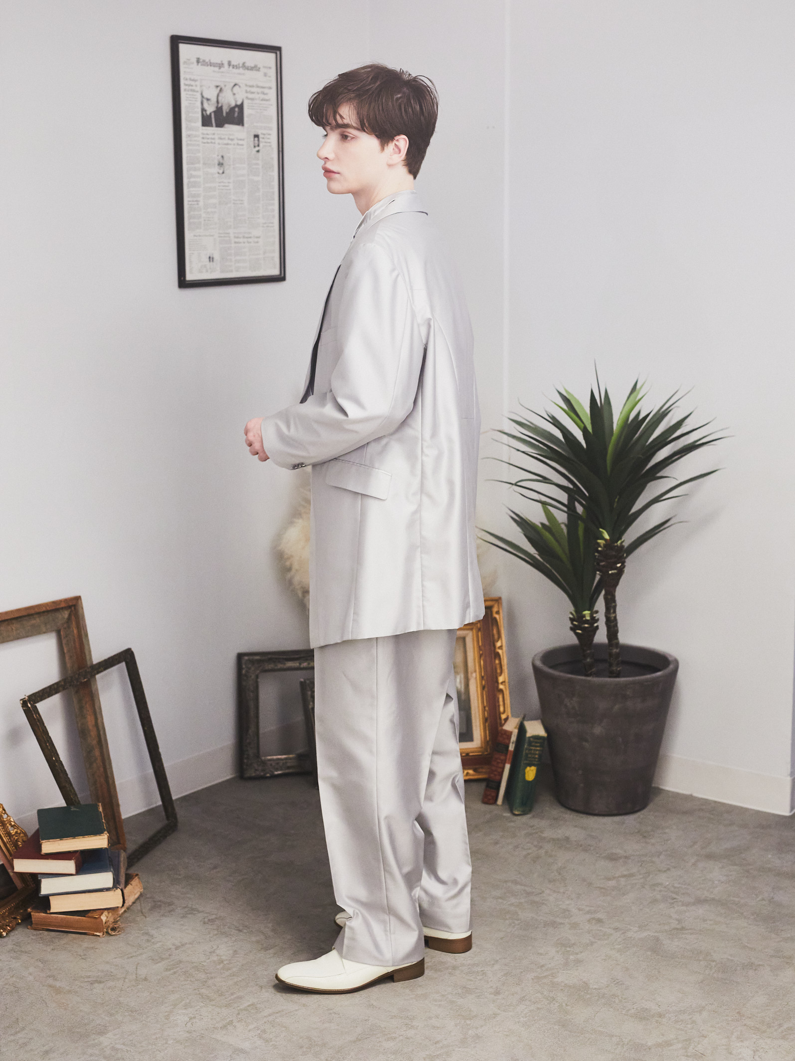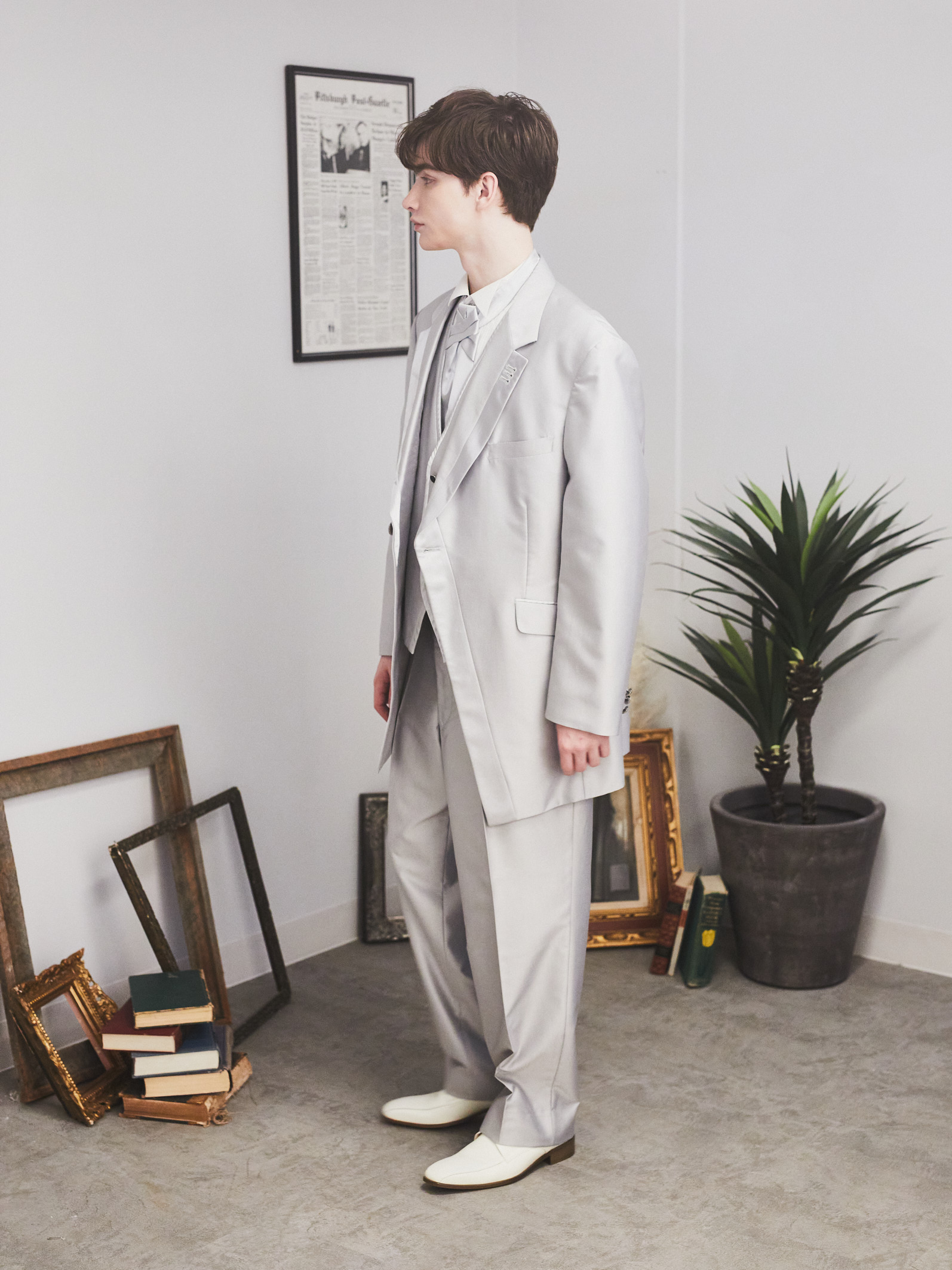 光沢のあるシャイングレーのモーニングコートのジャケットです。下襟の先がとがったピークドラぺルタイプです。モーニングコートは昼間の時間帯で最も格式の高い正礼装です。シングルブレストという生地を重ねないい形でボタンは一つ。きちんと感を大切にされたい新郎様や非日常を味わいたい方にオススメのスタイルです。少しおしゃれなカジュアルに着崩すならベストはチェックやストライプ柄や、ワインレッド、ゴールド、シルバー、グレー、スモーキーピンク、ブラック、ブルーなどのベストを差し色として合わせるのもオススメです。合わせるシャツをチェック、ドット、ストライプ、花柄、ネイビー、ブラック、グレーシャツで合わせてカジュアルな二次会タキシードとしても素敵。また白のウィングカラーシャツを合わせればきちんとした結婚式や披露宴向けのフォーマルなコーディネートになります。会社の懇親会などのパーティーや二次会ウェディング・海外やフォトウェディング、前撮りにまで幅広いシーンでご使用いただけます。オールシーズンに適してます。