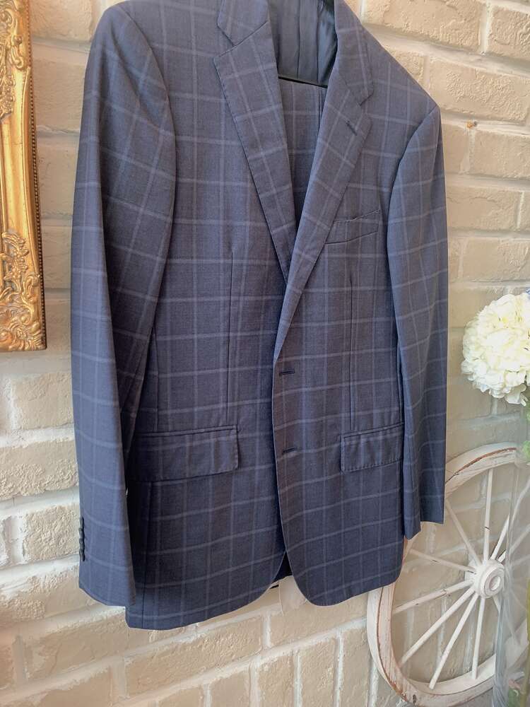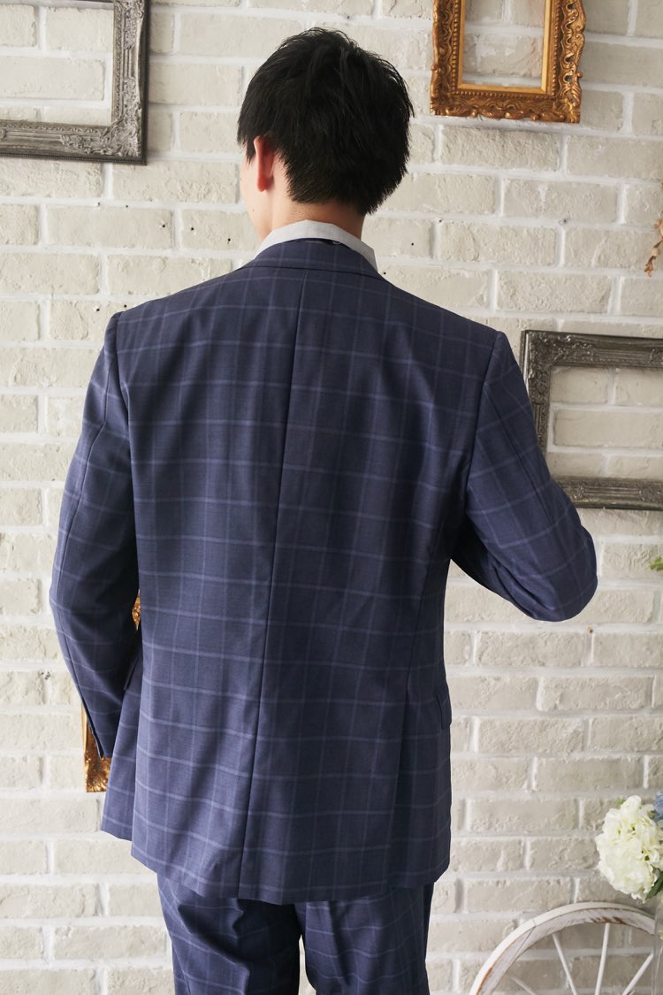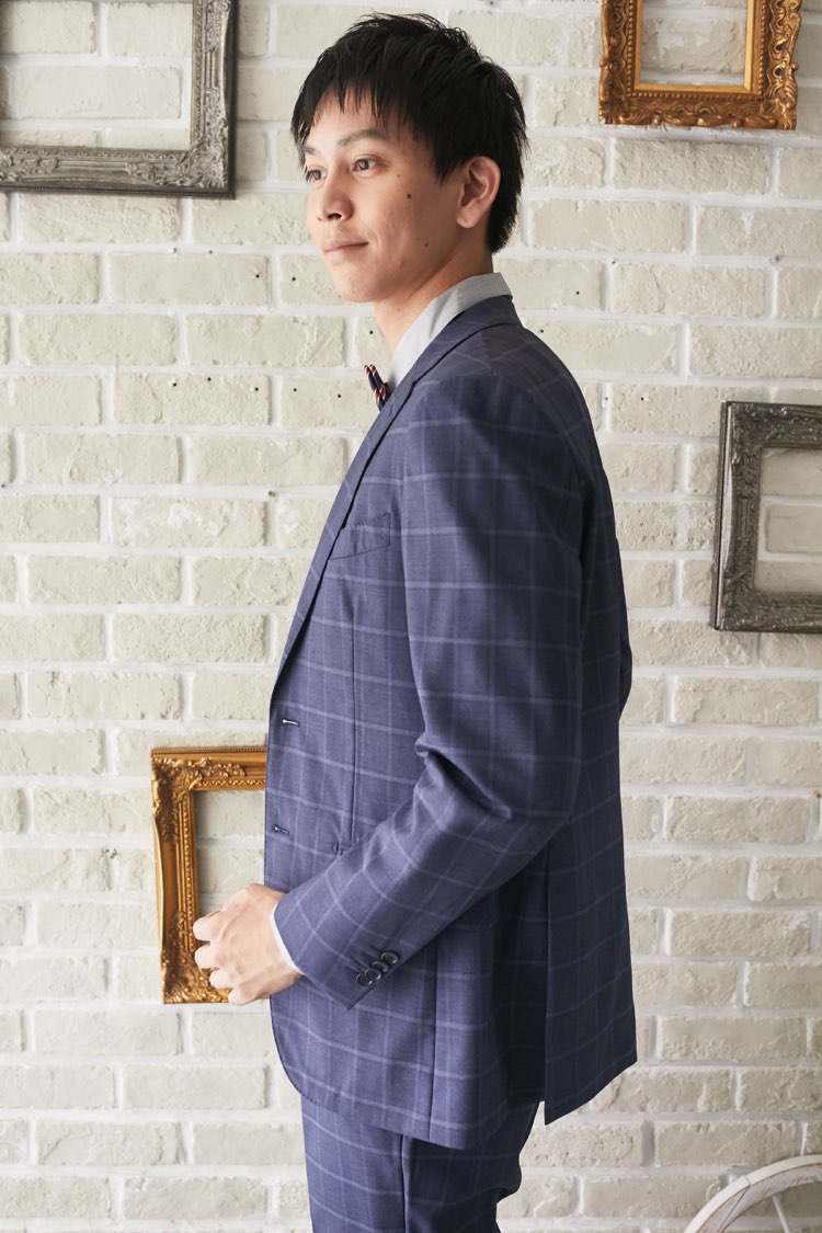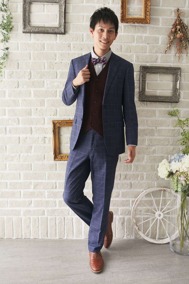 濃いめブルーチェック柄のジャケットです。ベストのみワインレッドやグレーホワイトカラーなどのベストを差し色として合わせるのもオススメです。パンツを白デニムで合わせてもおしゃれです。合わせるシャツを水色やグレーシャツで合わせてカジュアルな二次会タキシードとしても素敵。また白のウィングカラーシャツを合わせればきちんとして爽やかなコーディネートになります。また裏地もカラフルなストライプカラーになっていておしゃれですよ。二次会ウェディング・海外やフォトウェディング、前撮りにまで幅広いシーンでご使用いただけます。結婚式お呼ばれや会社の懇親会などのパーティーにも。オールシーズンに適してます。