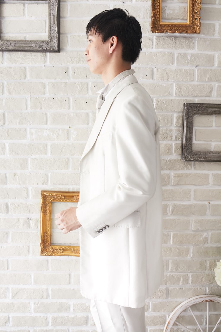 光沢のあるアイボリーのシンプルタキシード。少しおしゃれなカジュアルに着崩すならベストはチェックやストライプ柄や、ワインレッド、ゴールド、シルバー、グレー、スモーキーピンク、ブラック、ブルーなどのベストを差し色として合わせるのもオススメです。合わせるシャツをチェック、ドット、ストライプ、花柄、ネイビー、ブラック、グレーシャツで合わせてカジュアルな二次会タキシードとしても素敵。また白のウィングカラーシャツを合わせればきちんとした結婚式や披露宴向けのフォーマルなコーディネートになります。結婚式・披露宴・パーティー・二次会ウェディング・海外ウェディング・フォトウェディング、前撮りにまで幅広いシーンでご使用いただけます。オールシーズンに適してます。
